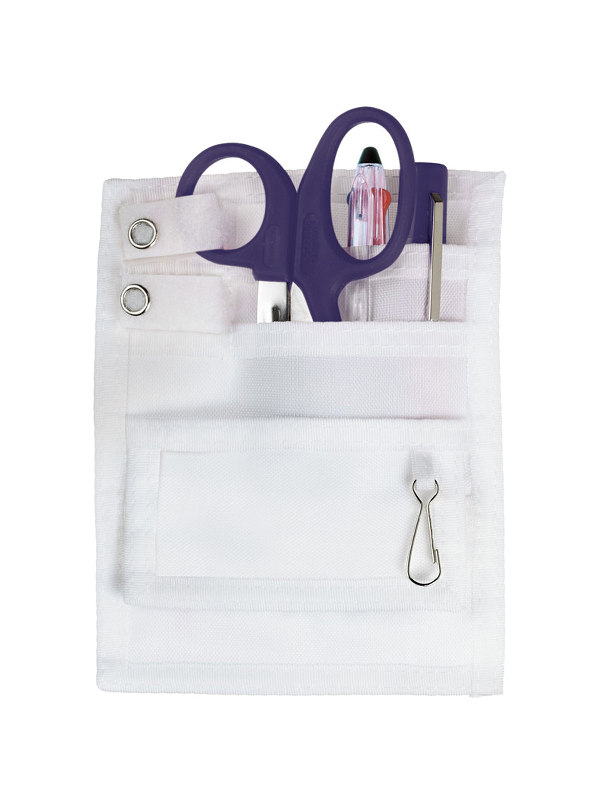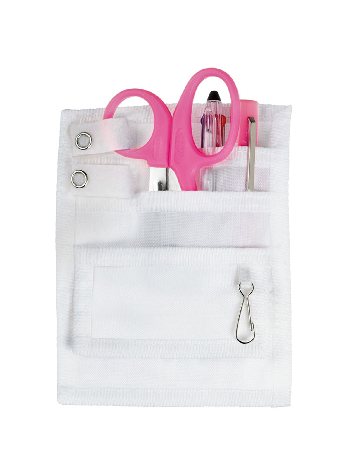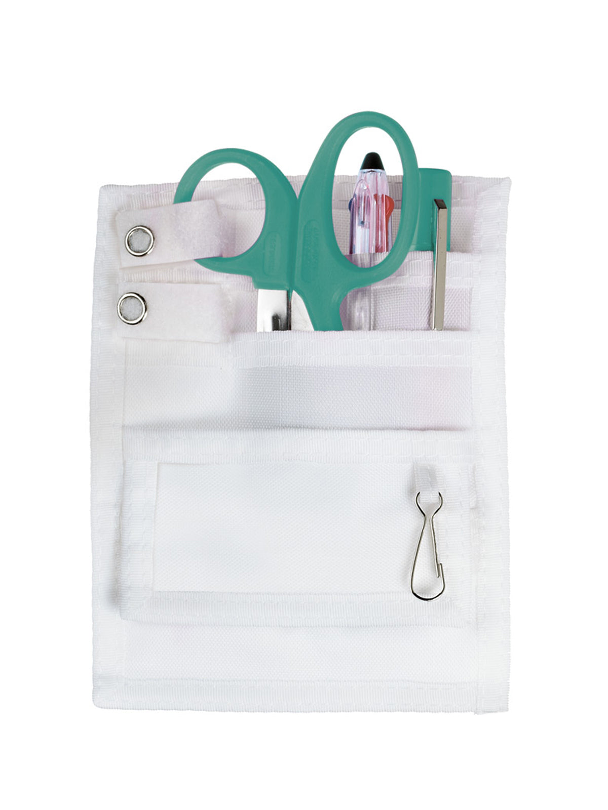 The standard organizer enhanced with a back pocket for a total of 5 pockets. Key chain clip and Velcro tabs to secure instruments. Comes with a 5.5" Utility scissor, disposable pupil gauge penlight and 3-color chart pen. WARNING: California's Proposition 65.