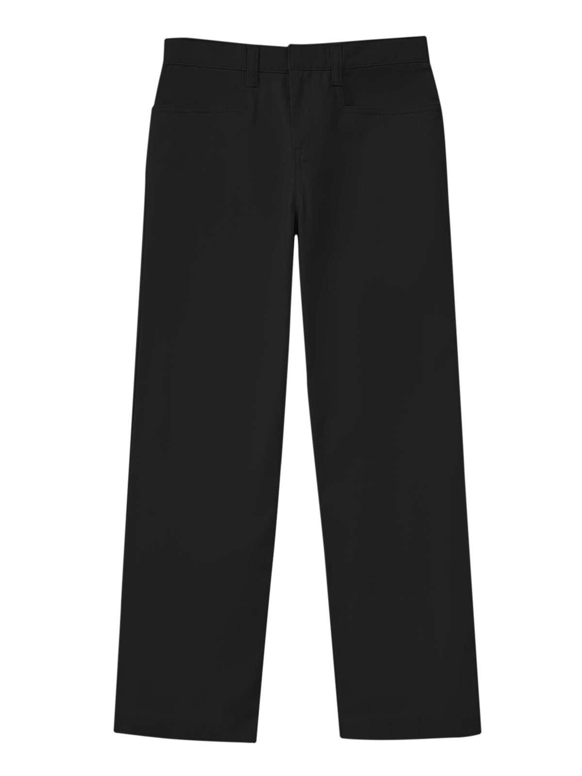 Stretch twill pant with a lower rise that sits below the natural waist with a short fly, two front pockets, back welt pocket, belt loops and hook-and-eye closure.