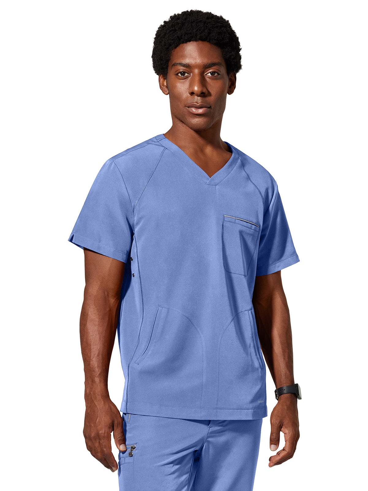 The Spencer top features a men's modern fit with moisture wicking, 4-way stretch fabric. This top also features a v-neckline, side vents, and back shoulder yoke. Pockets include two front welt pockets and one chest pocket. Center back length: 29.5"