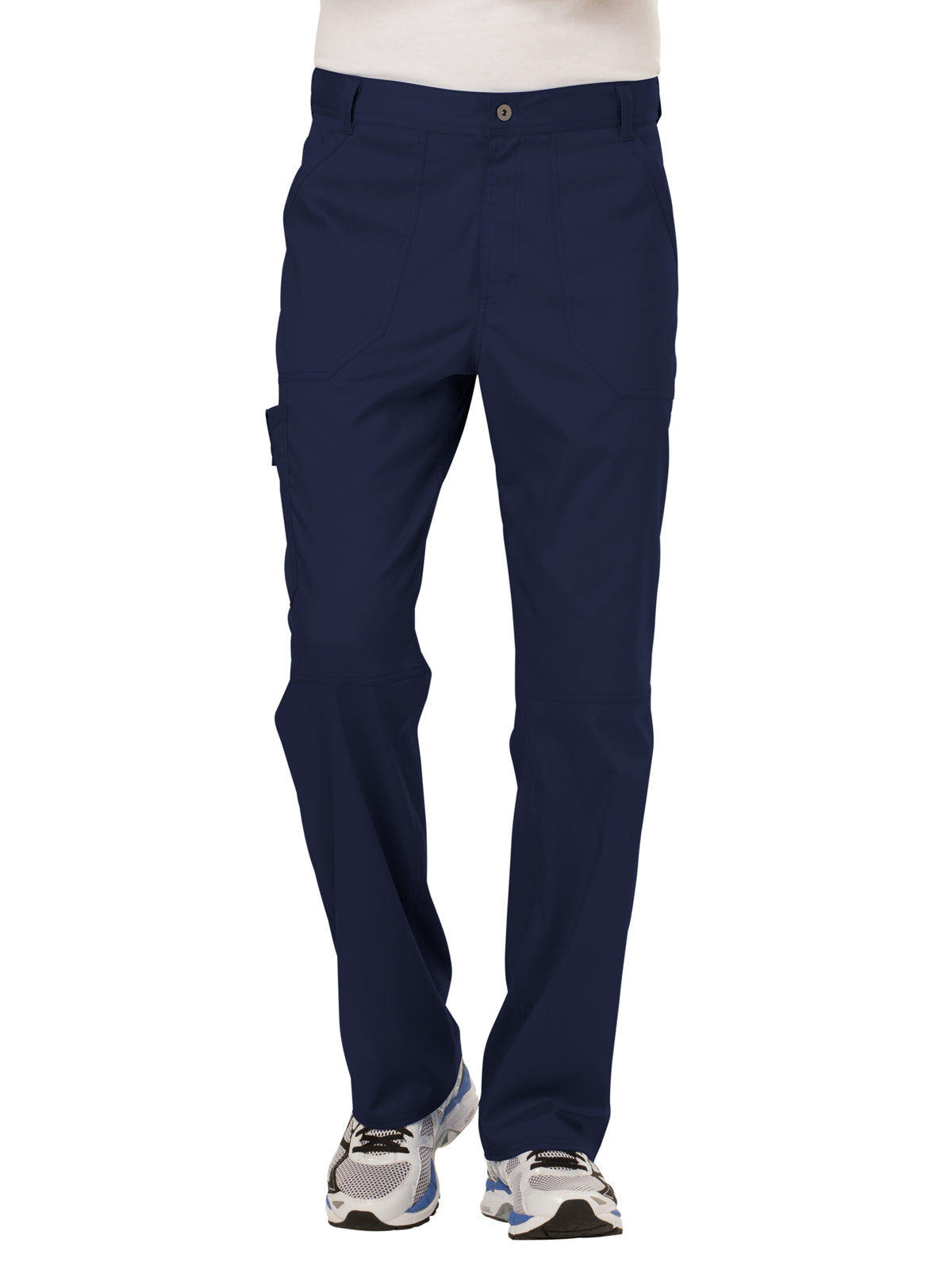 A men’s modern fit tapered leg pant includes a functional inside drawstring, and a back elastic waistband. Features: five belt loops, a zip fly with a button closure, front patch pockets, a logo label with a bungee loop, a right double cargo pocket with a snap I.D. loop, back patch pockets, and knee seams.