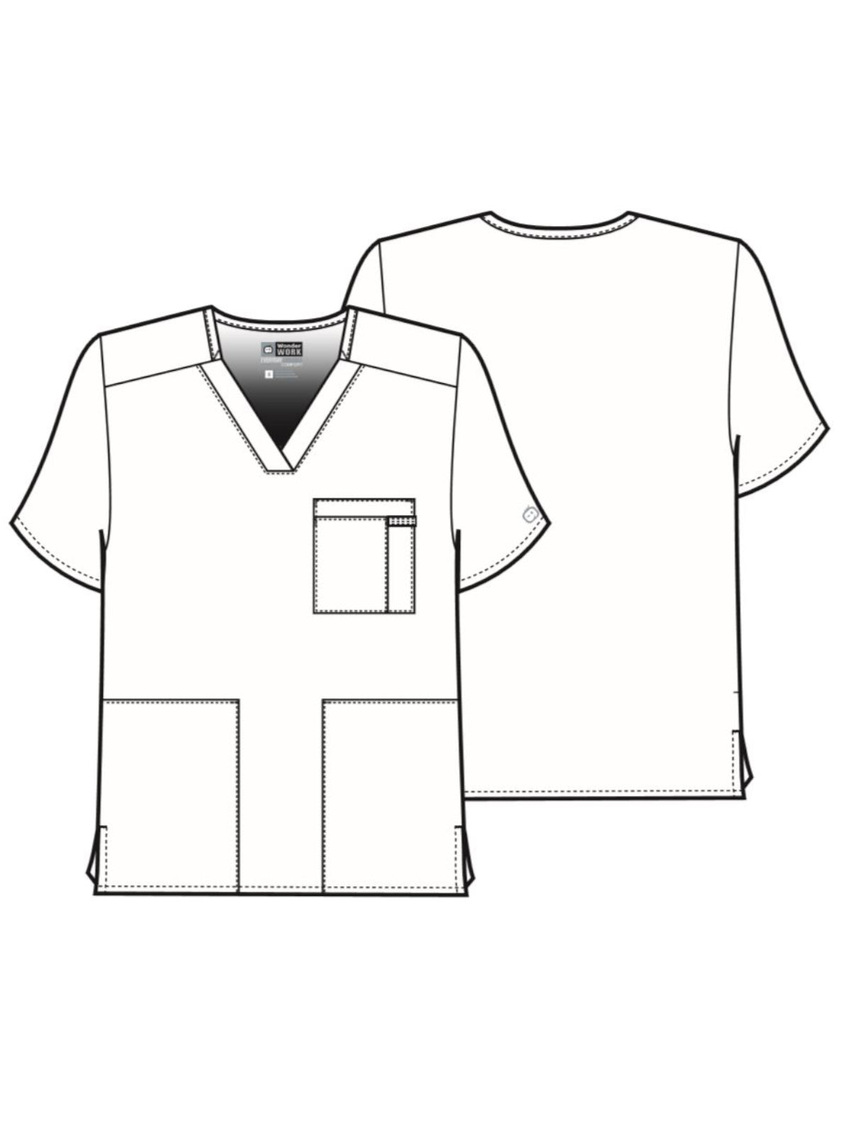 WonderWORK's Men's V-Neck Scrub Top! This top features a modified V-Neck and shoulder detail for a sporty, masculine look. Pockets include two front lower pockets, and one double chest pocket with a utility loop. A longer length in the back and vented sides offer added security and comfort. Center back length: 31", Center front length: 30"