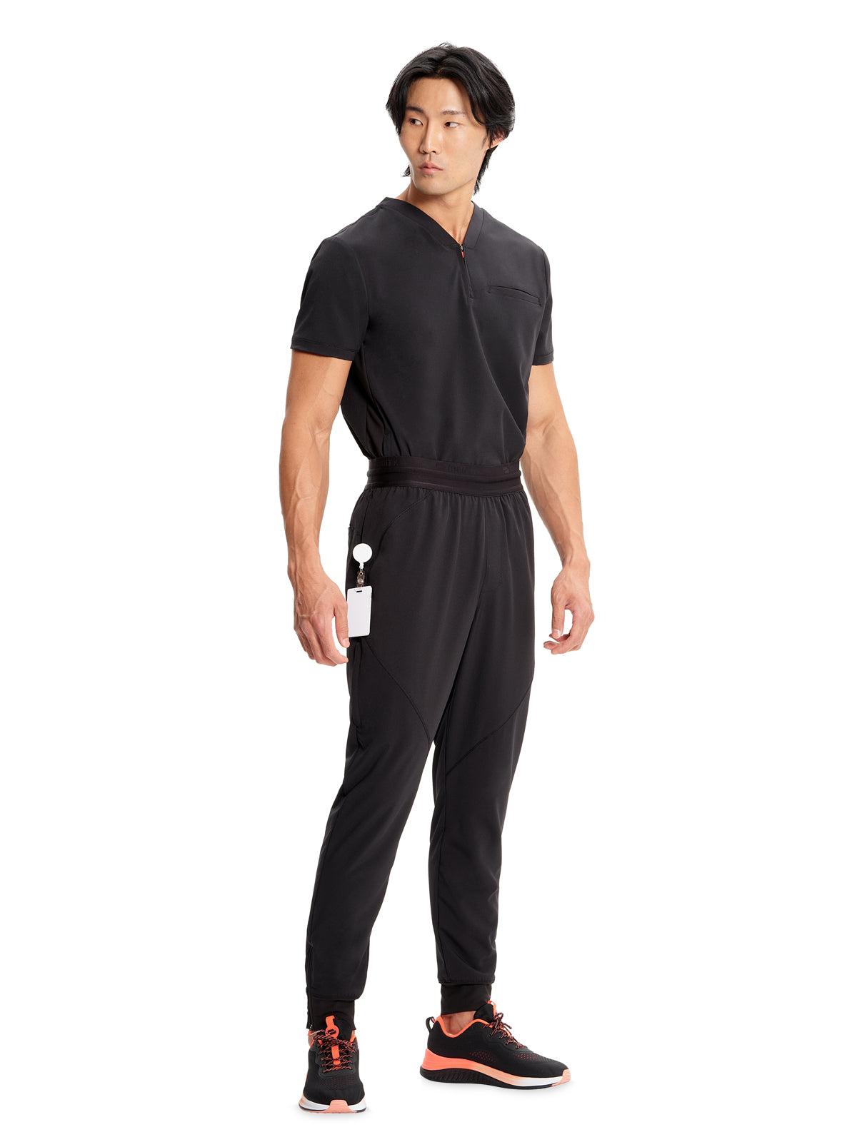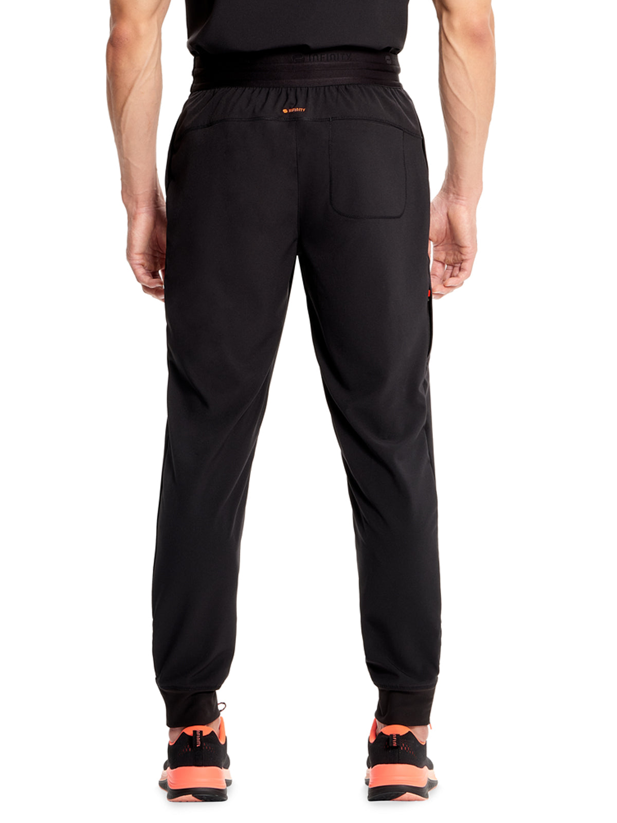 This Men's fit pull-on jogger has a logo elastic waistband with an interior drawstring and a curved back yoke seam. There are four pockets for organized storage: two in-seam side pockets, one zipper cargo pocket with contrast mesh pocket bag on the wearer's right side, and one in-seam back pocket. Other features include stylized front seams, zipper vents at hem for an expandable leg opening, and dyed-to-match rib-knit cuffs. Zipper vents feature sporty signature contrast mesh gusset. Contrast colored soft zipper pulls for easy grip. Tapered leg, 10" opening. Inseam: 30"