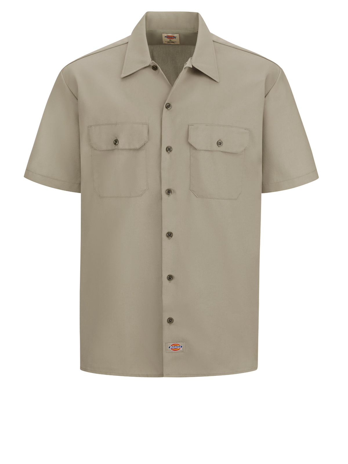 Dickies’ Short Sleeve Traditional Work Shirt features a generous cut through the shoulders and chest to give you plenty of room for movement. It has a square tail design that looks good tucked in or untucked. It's crafted from our sturdy polyester/cotton—a twill work cloth woven for durability and longevity. This shirt will also help you stay dry with its moisture-wicking properties. For added utility, two chest flap pockets with button closure provide storage on the job. Other details include pencil division on left pocket, standard spread collar and dyed-to-match melamine buttons.
