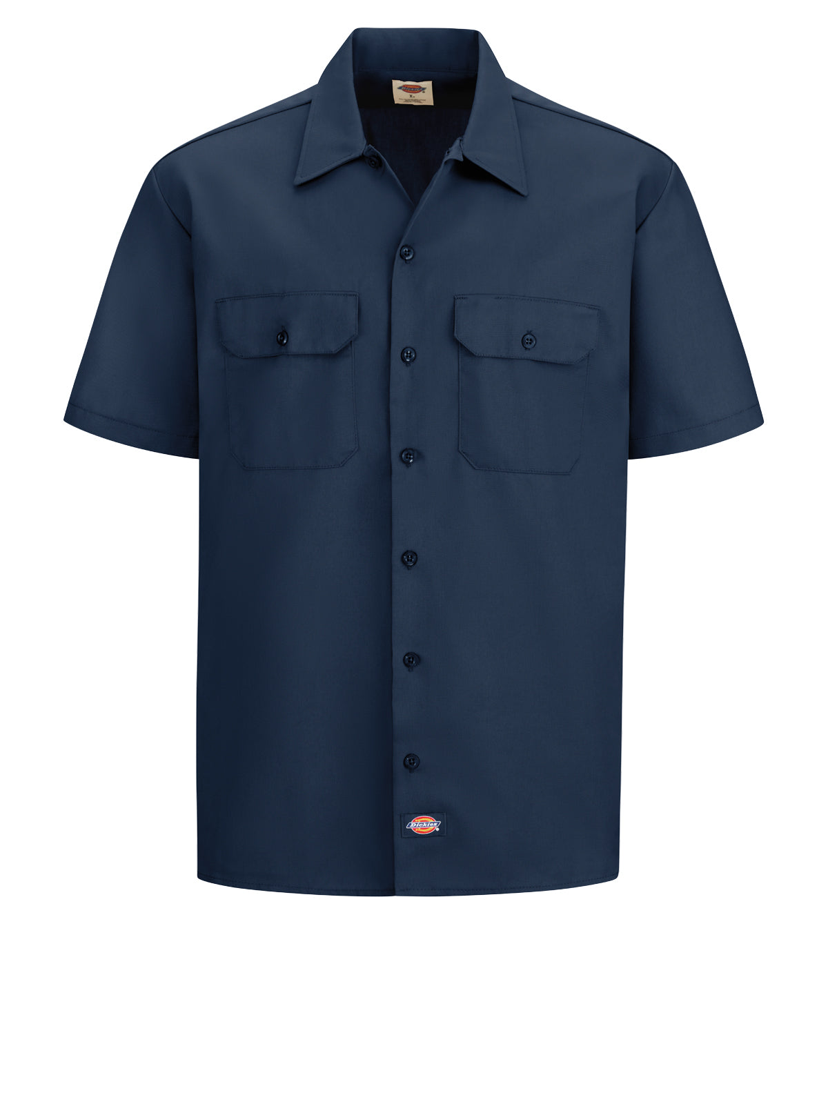 Dickies’ Short Sleeve Traditional Work Shirt features a generous cut through the shoulders and chest to give you plenty of room for movement. It has a square tail design that looks good tucked in or untucked. It's crafted from our sturdy polyester/cotton—a twill work cloth woven for durability and longevity. This shirt will also help you stay dry with its moisture-wicking properties. For added utility, two chest flap pockets with button closure provide storage on the job. Other details include pencil division on left pocket, standard spread collar and dyed-to-match melamine buttons.