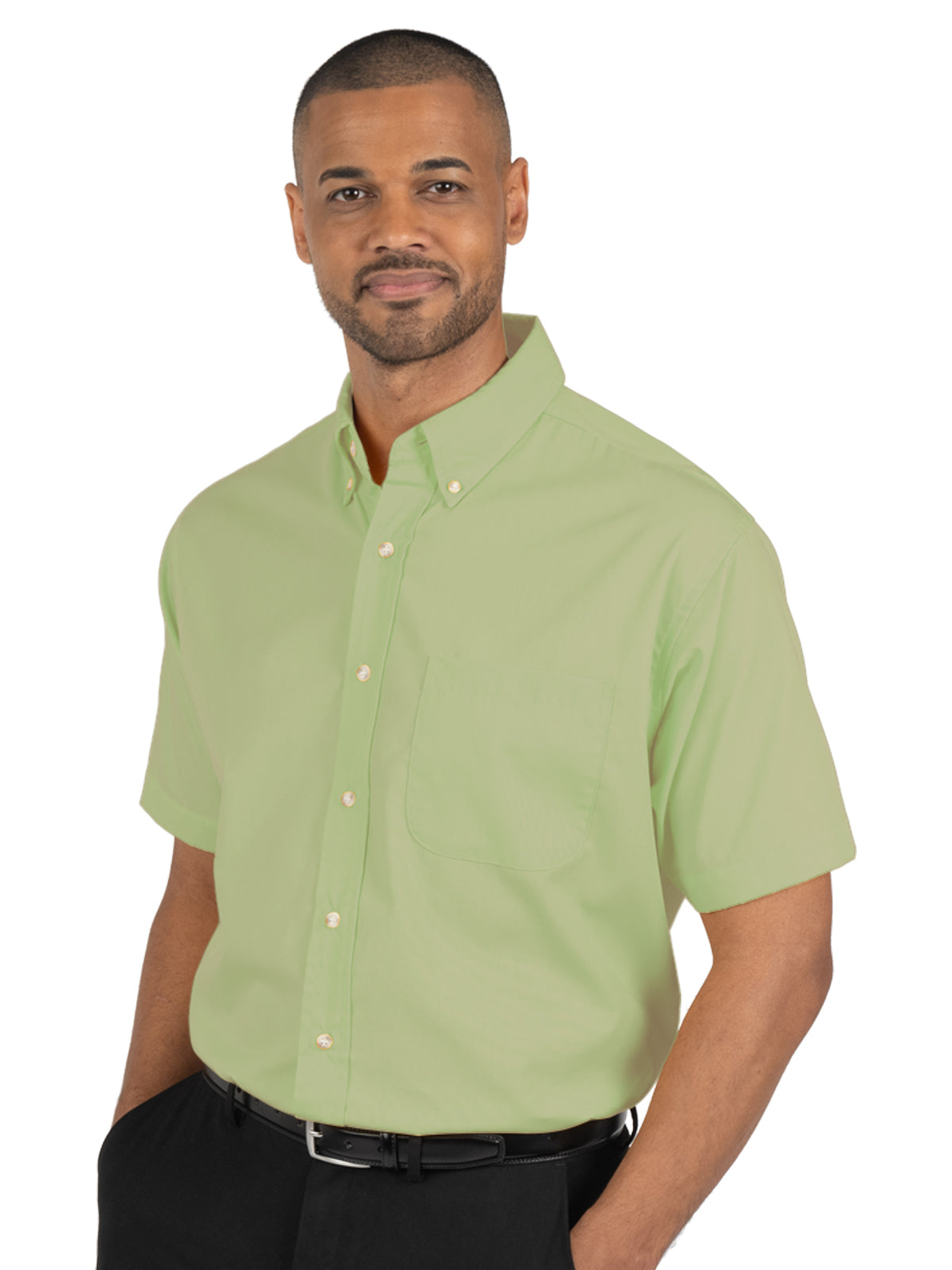 For a shirt with short sleeves but not short on style, look no further than this men's easy-care 5.5 oz. poplin shirt! Made of a 65% polyester/35% cotton blend with stain release, this wrinkle- and crease-resistant item features a patch pocket, a double-back yoke, two side back pleats, hemmed sleeves and a button-down collar. It is available in an array of colors and in sizes from S-10XL. Tall sizes (7216ST: LT-3XLT) are available in colors Red, Royal, Navy, Hunter, White, Tan and Black only.