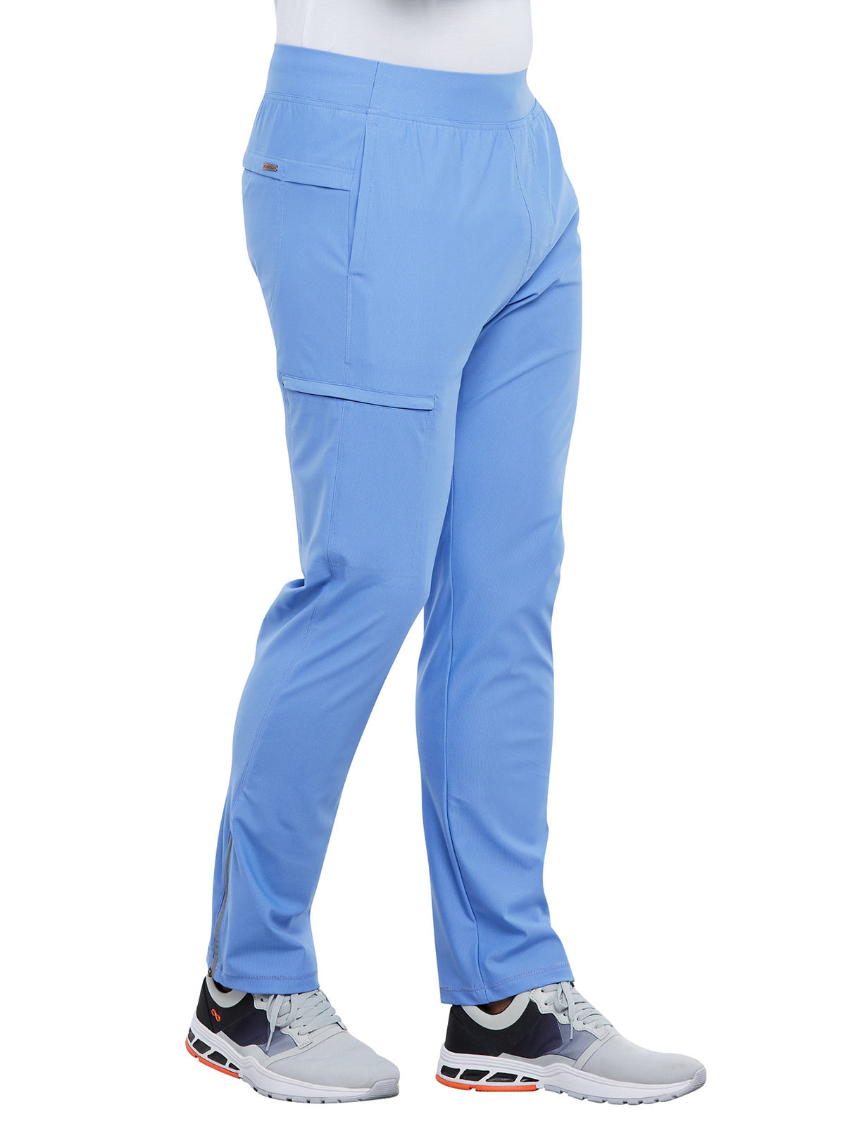 This Men's tapered leg pant features an enclosed elastic waistband, faux front fly, front angled pockets, two back in-seam pockets at back yoke seam, and one roomy side cargo zip pocket. This active-inspired, form-contouring pant is ultra-comfortable with optimal stretch, and adjustable side zip vents. Inseam: 31". Leg Opening: 14 1/2".