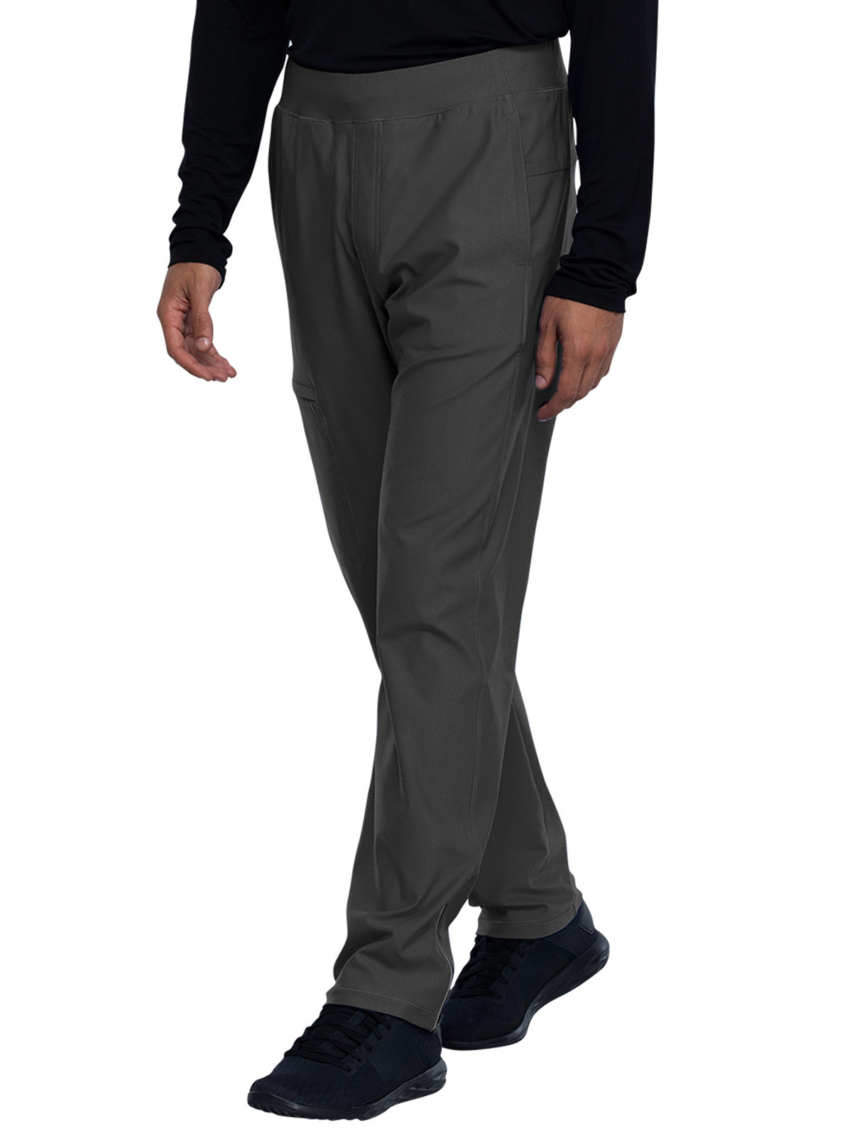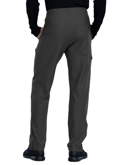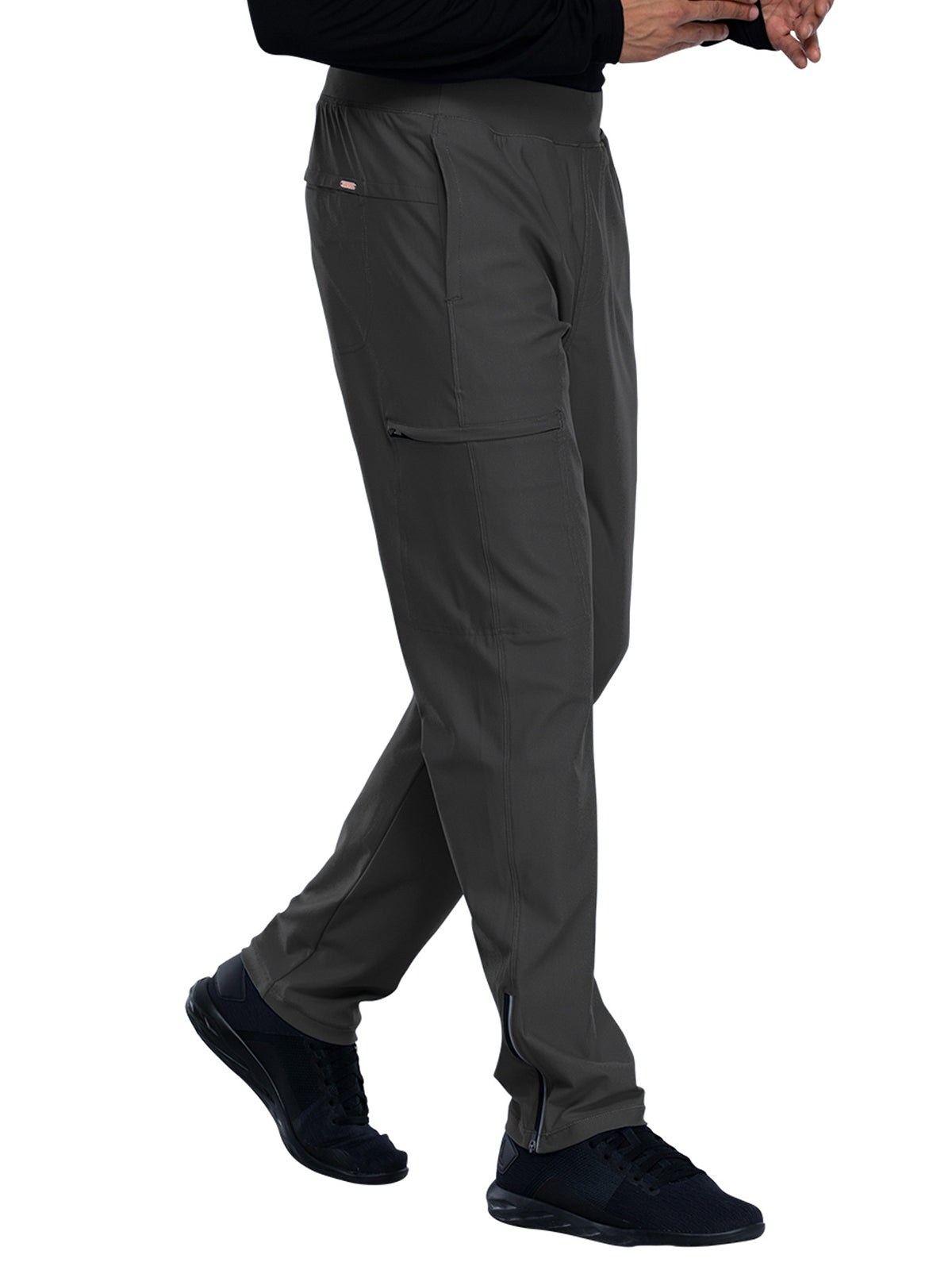 This Men's tapered leg pant features an enclosed elastic waistband, faux front fly, front angled pockets, two back in-seam pockets at back yoke seam, and one roomy side cargo zip pocket. This active-inspired, form-contouring pant is ultra-comfortable with optimal stretch, and adjustable side zip vents. Inseam: 31". Leg Opening: 14 1/2".