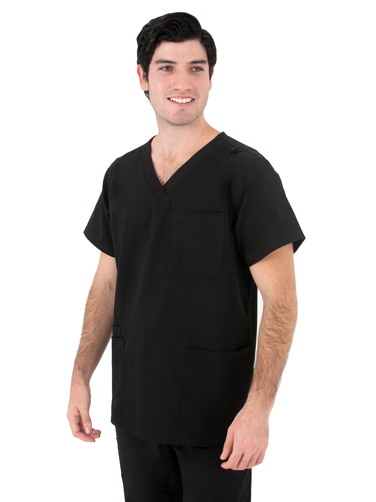 The LifeThreads Ergo 2.0 men's v-neck top features two front pockets with an interior cell phone pocket, a single chest pocket, a dropped shoulder with a v-loop badge holder, side vents at the hem for ease of movement, and a banded v-neckline. Center back length: 28" (Medium)