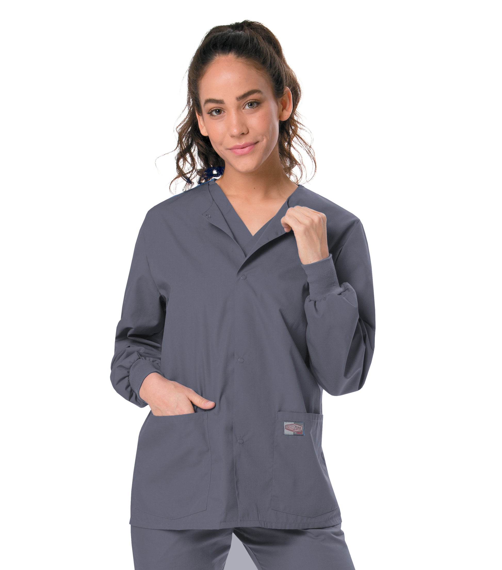 - Classic & Comfortable Work Wear: Presenting the Unisex Warm-Up Jacket With Knit Cuffs. Crafted with two top entry pockets and an additional side pocket, this versatile scrub jacket is the perfect addition to any medical scrubs. Medium Length: 28".