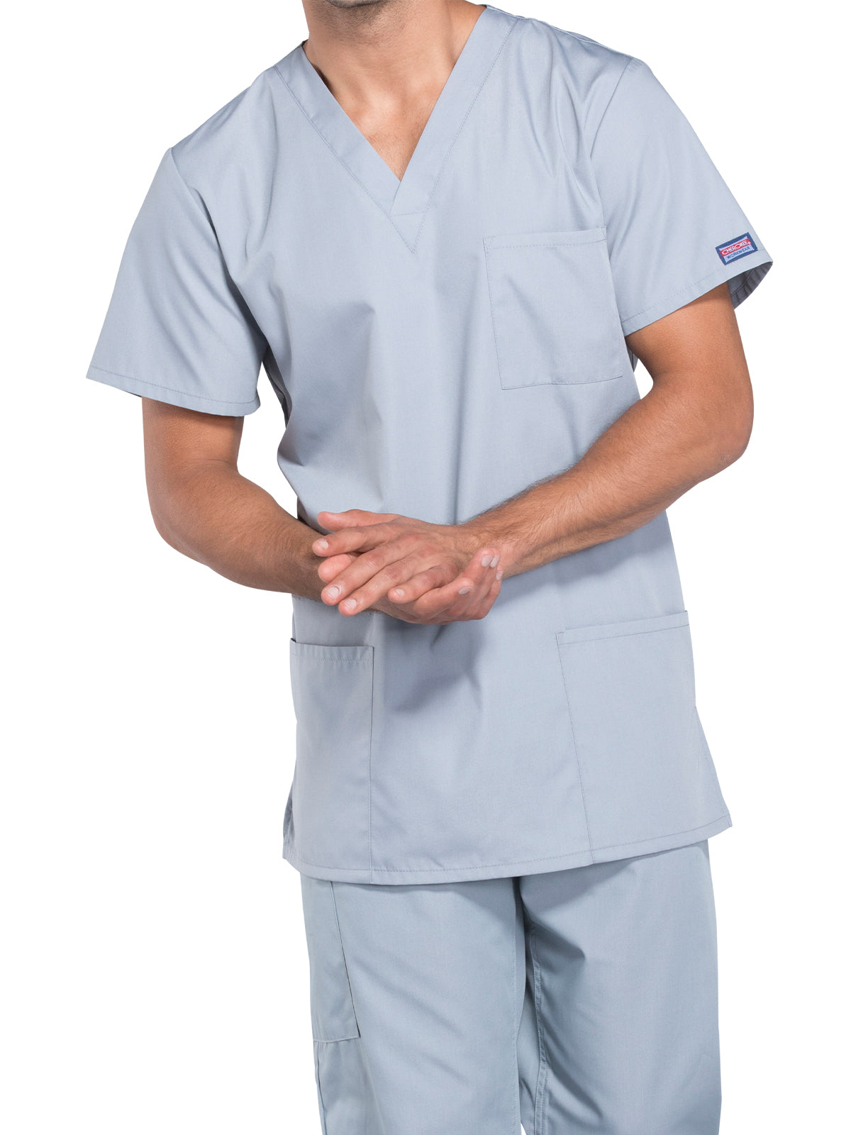 This unisex traditional fit v-neck top has one chest pocket, two patch pockets, and side vents.