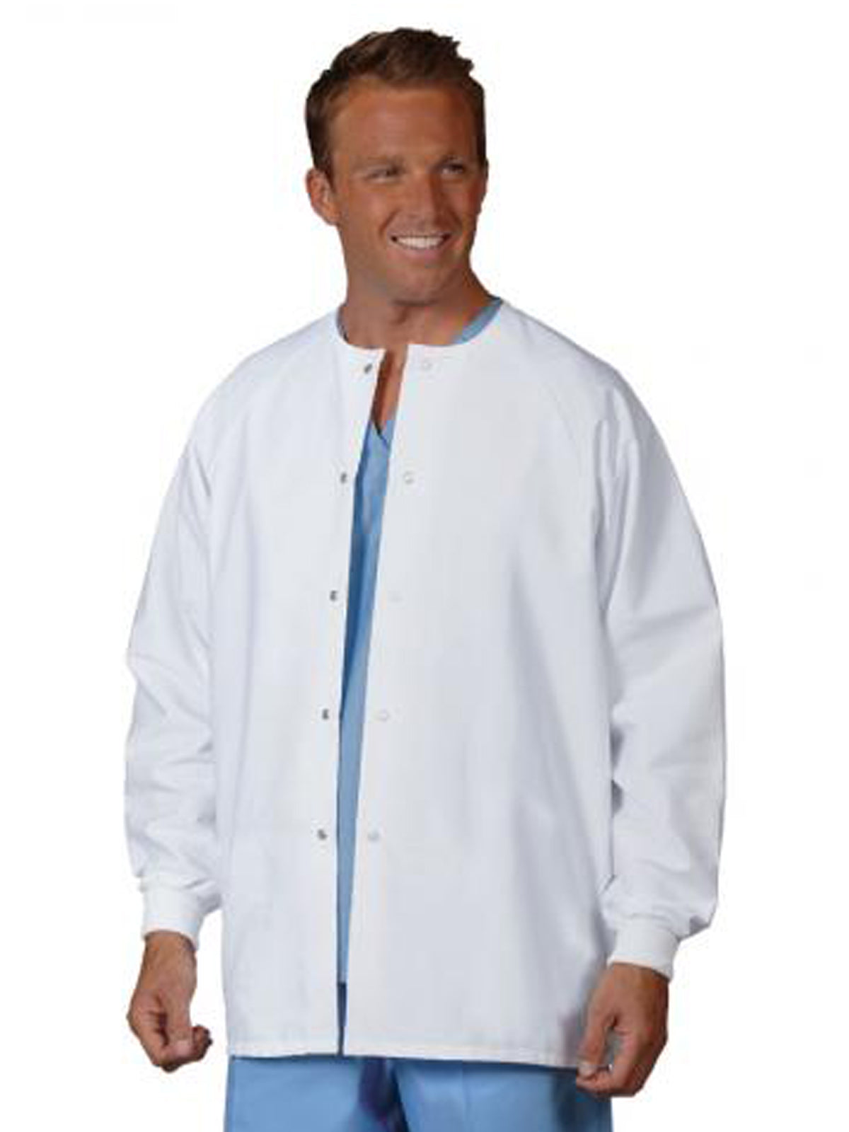 These unisex, pocketless warm-up scrub jackets feature raglan sleeves, a snap front closure, and coordinating knit cuffs.