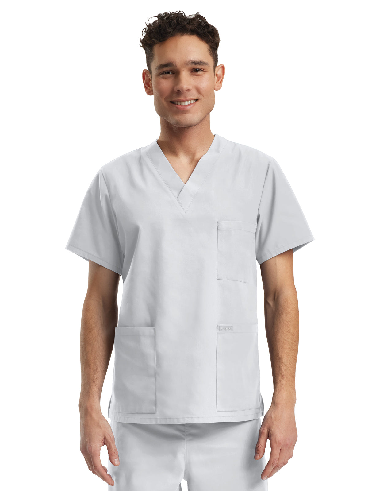 This unisex v-neck top features one chest pocket and two lower patch pockets, ensuring your items are easily accessible and securely stored. Side vents are incorporated for enhanced mobility and comfort.