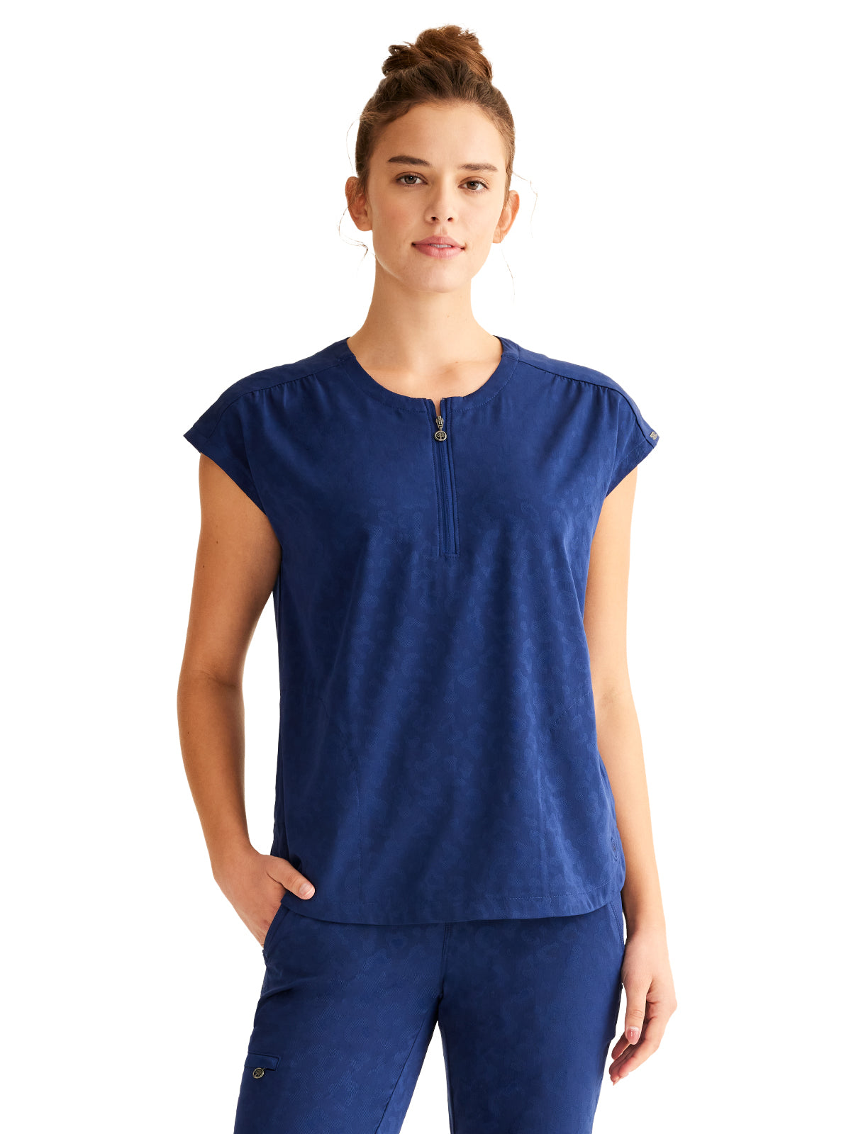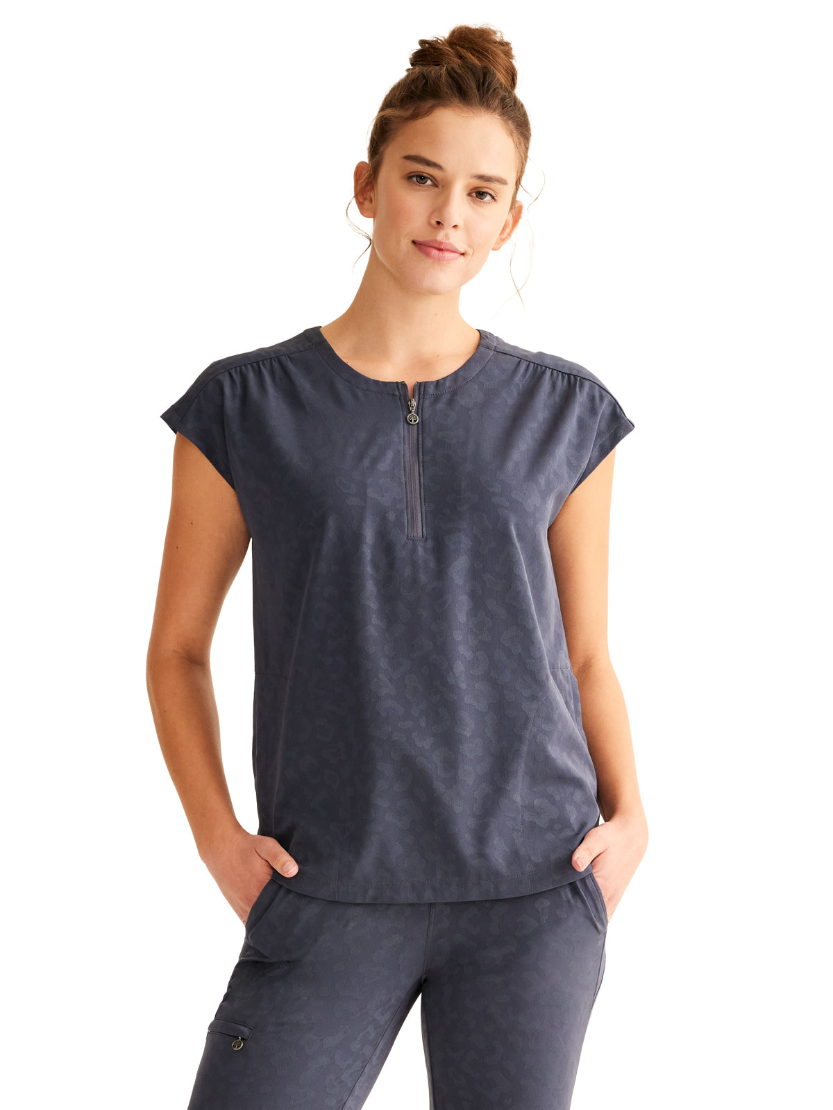 This Relaxed fit dolman sleeves round neck top has a partial zip at the center front, a back yoke seam with a box pleat, and 2 side welt pockets. Other features include side vents and a rounded hem. Center back length: 26".