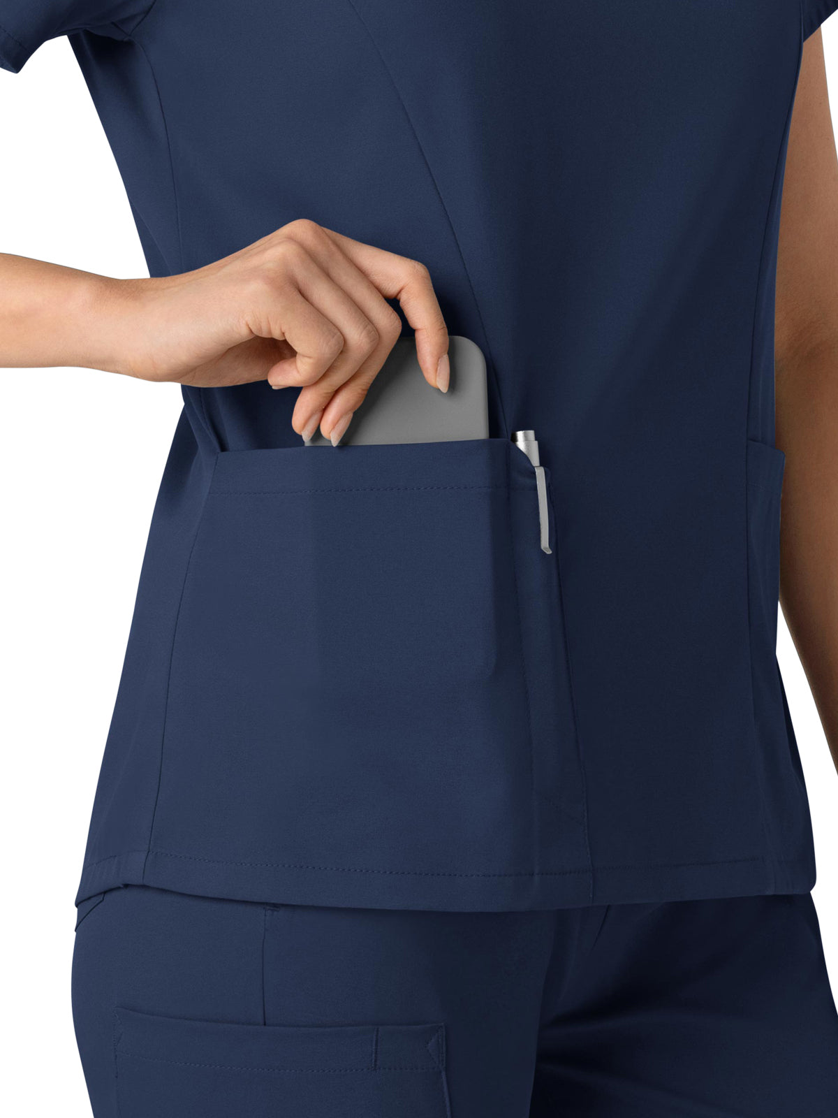 Introducing our Women's 2-Pocket V-Neck Scrub Top, the epitome of style, functionality, and sustainability. Crafted with a modern fit, this scrub top boasts a sleek V-neck design with badge loops adorning both shoulders for added utility. With three convenient pockets, including two top-loading pockets and a dedicated cellphone pocket, keeping your essentials close has never been easier. The notched pen slot on the wearer's right side ensures easy access to your writing utensils. Featuring a curved clean finished hem, this scrub top offers a polished look that's perfect for any healthcare professional. Made from a comfortable and stretchy sustainable fabric, it not only feels great but also supports eco-friendly practices. Easy to care for with machine wash cold and gentle tumble dry instructions, it's a must-have addition to your work wardrobe.