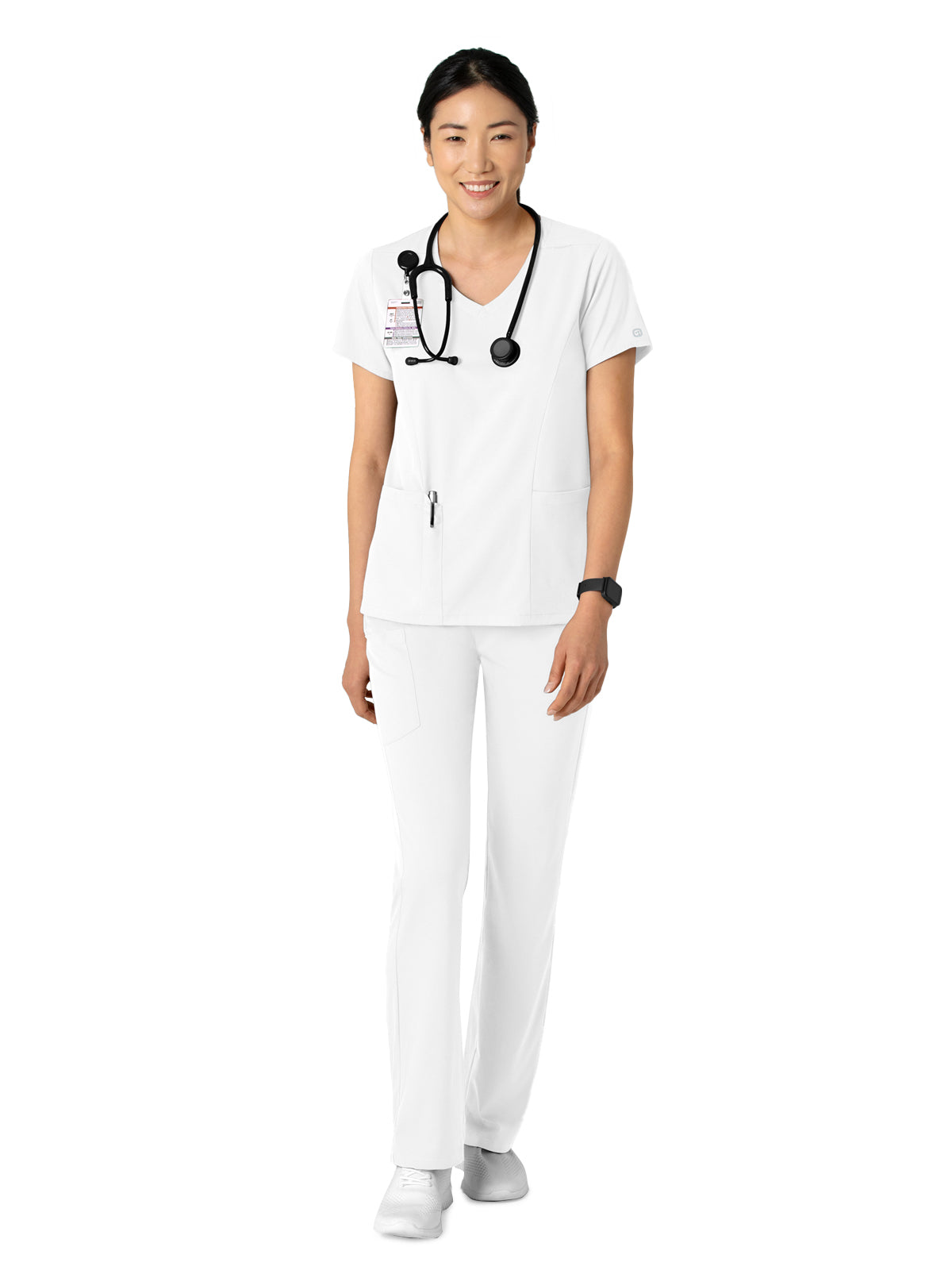 Introducing our Women's 2-Pocket V-Neck Scrub Top, the epitome of style, functionality, and sustainability. Crafted with a modern fit, this scrub top boasts a sleek V-neck design with badge loops adorning both shoulders for added utility. With three convenient pockets, including two top-loading pockets and a dedicated cellphone pocket, keeping your essentials close has never been easier. The notched pen slot on the wearer's right side ensures easy access to your writing utensils. Featuring a curved clean finished hem, this scrub top offers a polished look that's perfect for any healthcare professional. Made from a comfortable and stretchy sustainable fabric, it not only feels great but also supports eco-friendly practices. Easy to care for with machine wash cold and gentle tumble dry instructions, it's a must-have addition to your work wardrobe.