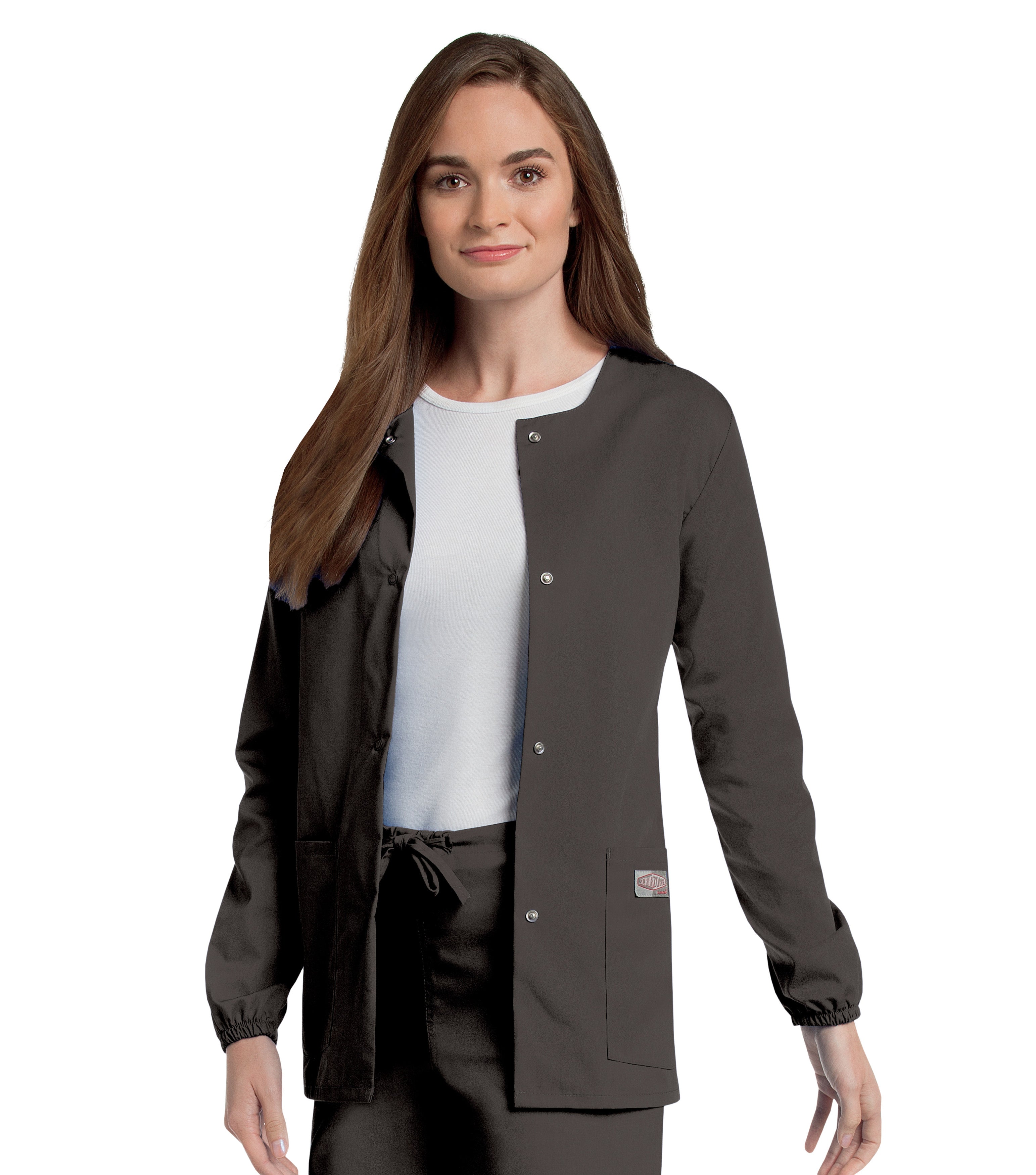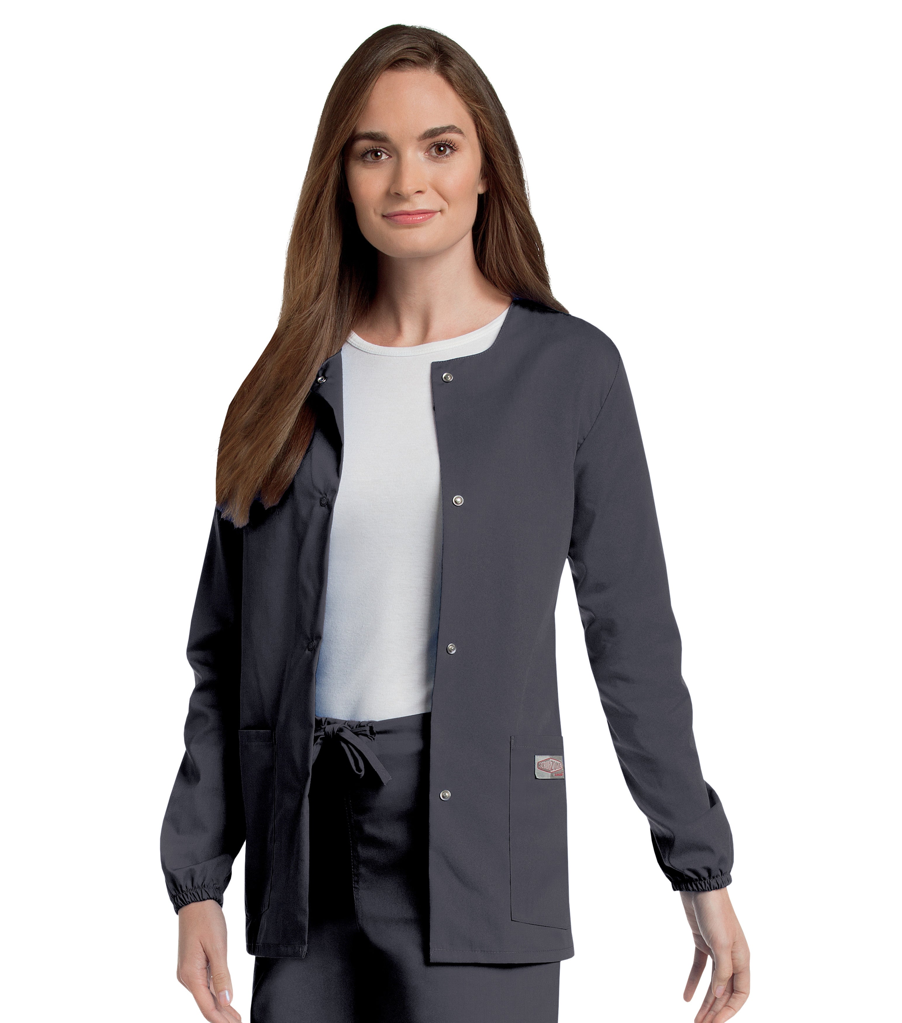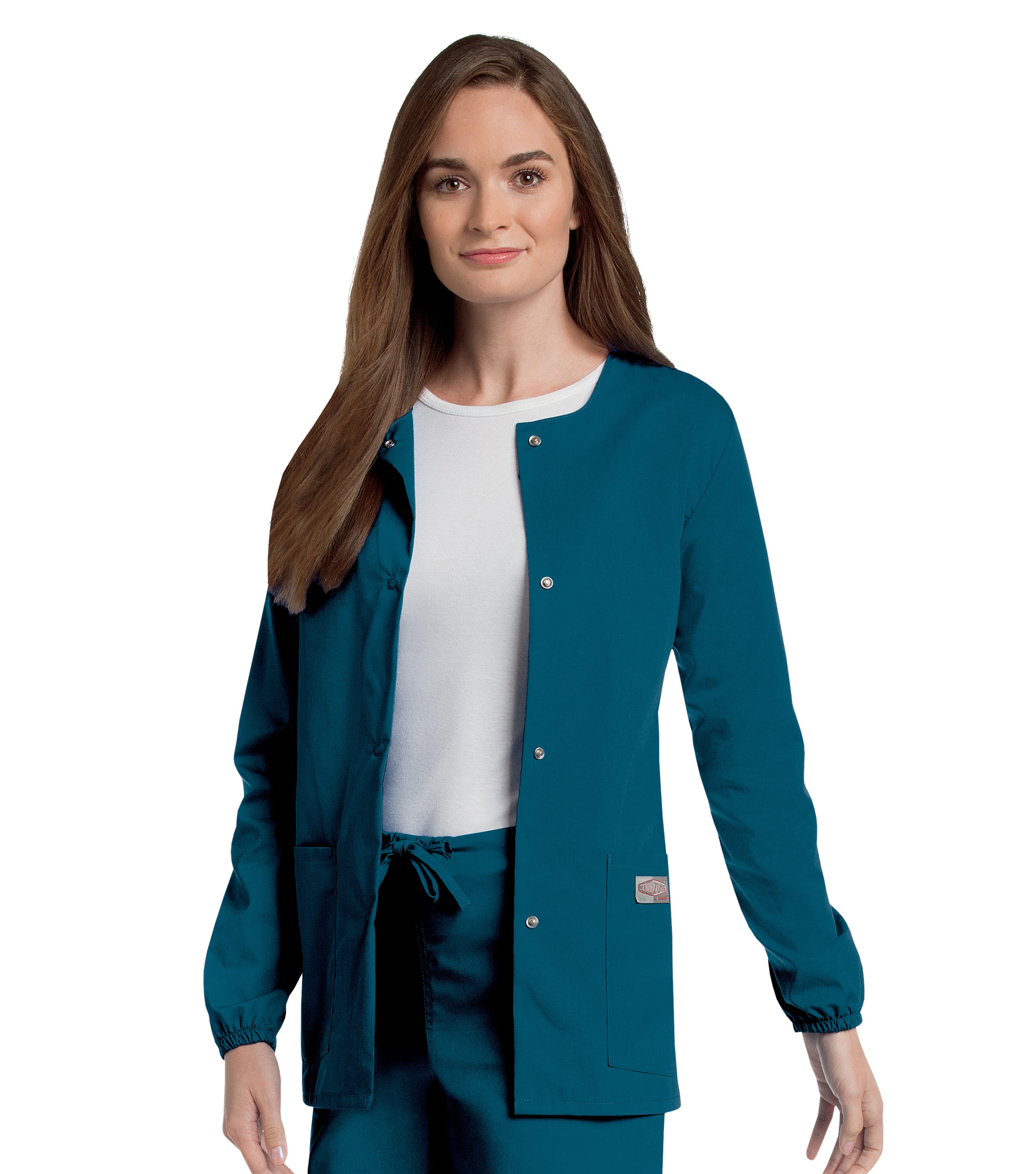 - Professional Workwear: The jewel neckline and snap-front closure of this scrub jacket makes ensemble swaps simple, while knit cuffs keep your sleeves securely in place; Length: 28 7/8" (Size Medium)