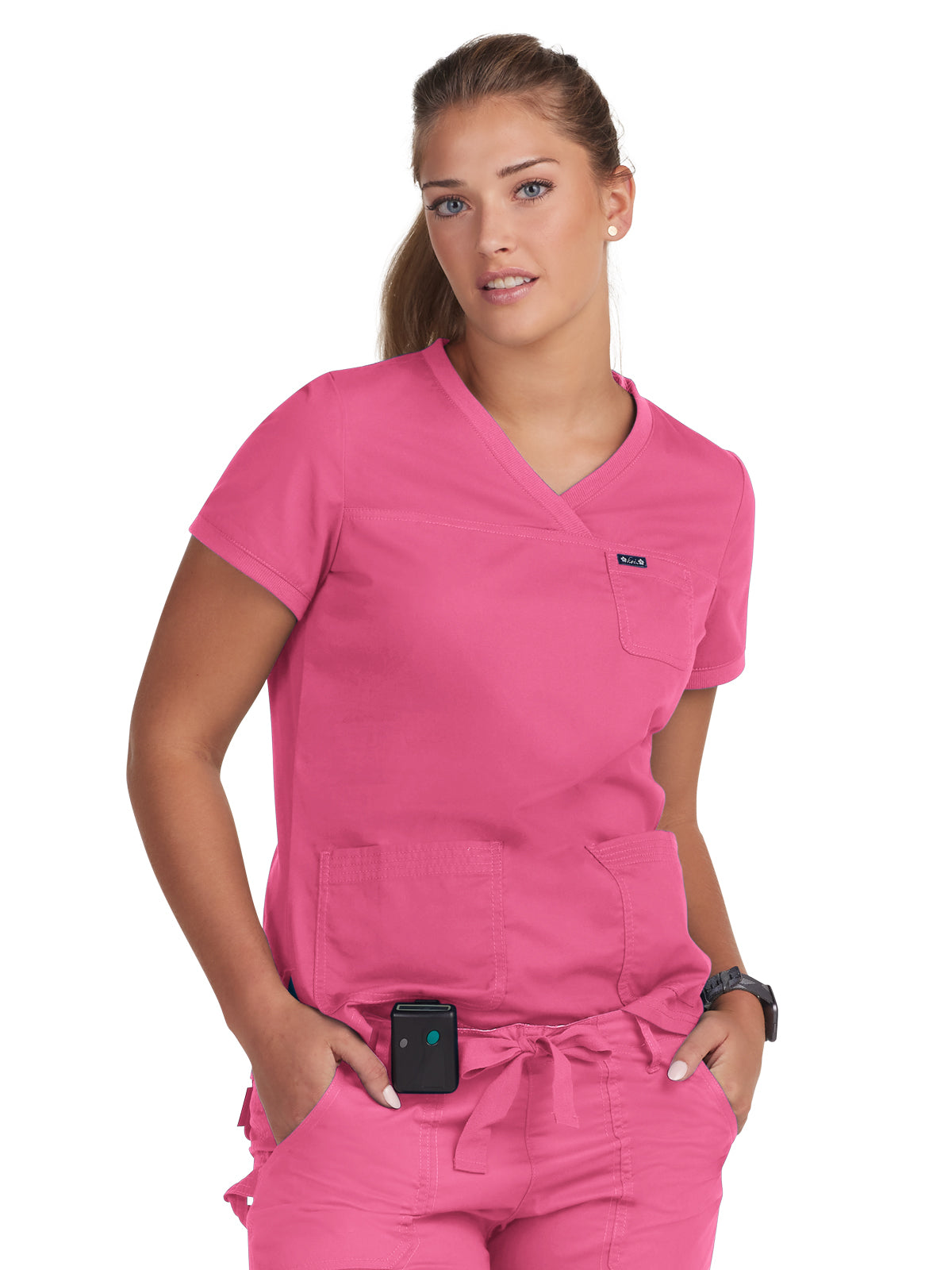 This scrub top features a top yoke with a mock wrap neckline trimmed with soft ribbing, rounded patch pockets, a cute little chest pocket and seamless back and Side vents to keep the fit comfortable and easy.