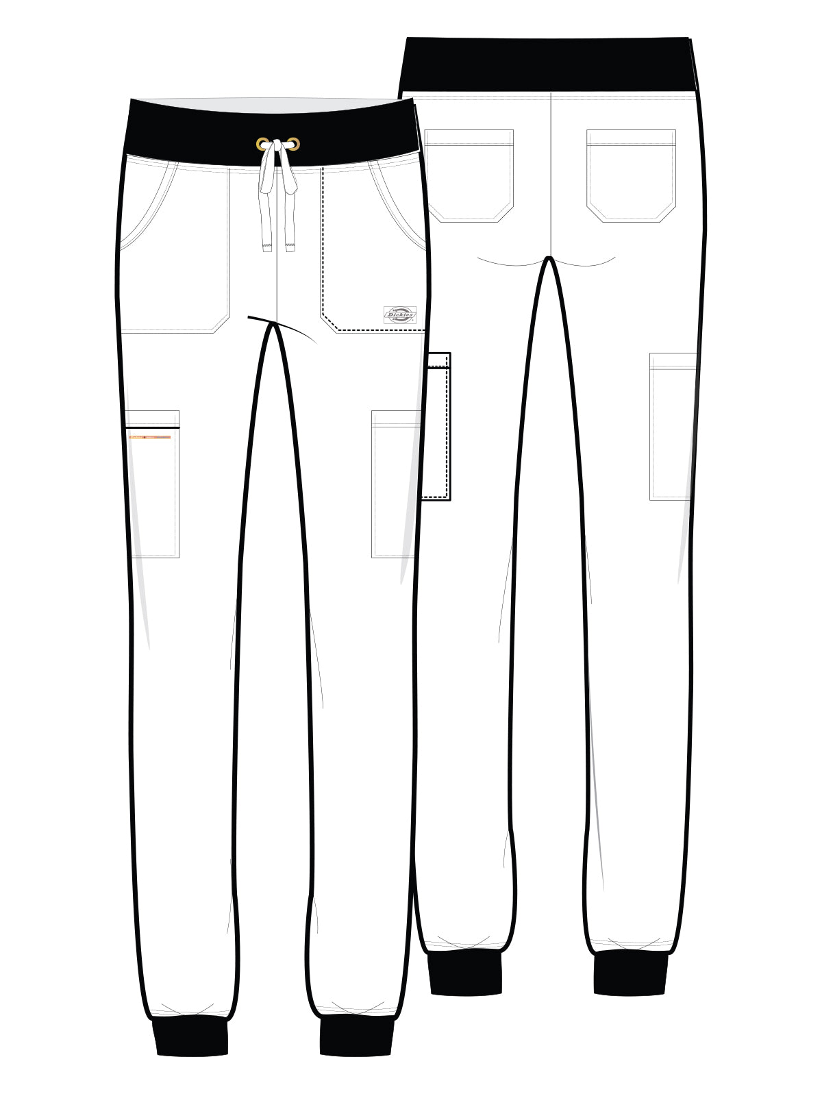 This mid rise jogger has a rib-knit covered elastic waistband with self drawstring. There are six pockets in total: two front patch pockets, two cargo pockets and two back patch pockets. Top of back pockets are finished with reverse hem for subtle design detail. Logo tape instrument loops inside wearer s right cargo pocket. Rib-knit cuffs complete the look. Contemporary fit. 12" opening. Inseams: Petite- 26 1/2", Regular- 29", Tall- 32"