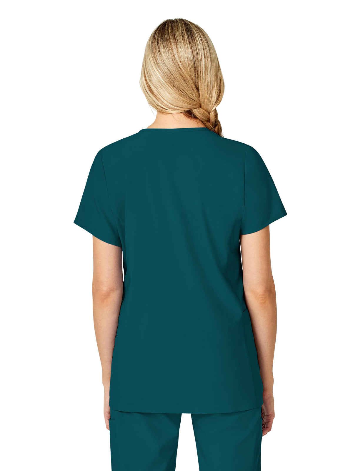 This women's maternity top features three top loading side panel pockets, one "No-Budge" cell phone pocket, and one pen slot, dyed-to-match grosgrain and badge loop, postnatal nursing tuck-away invisible zippers on front princess seams - hidden and convenient, adjustable elsatic empire center seam with interior comfort elastic pulls to cinch and grow with wearer, utility loop with silicone logo ring, curved back hem for coverage, and a WonderWink logo at front hem. Size M length: 29".