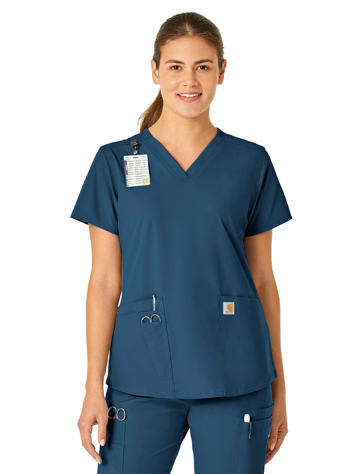 Built with Force technology to wick sweat, dry fast, and fight odors. FastDry® technology keeps you cool for all day comfort. Built to move with Rugged Flex® stretch technology. Stain Breaker® technology releases stains. Corded badgeID loop at shoulder. Two large top loading front pockets with internal cell phone pocket at left and additional internal pocket with scissor pocket at right. Princess seaming at back for tailored fit. Curved shirttail hemline. Size M Back Length: 27 3/4".