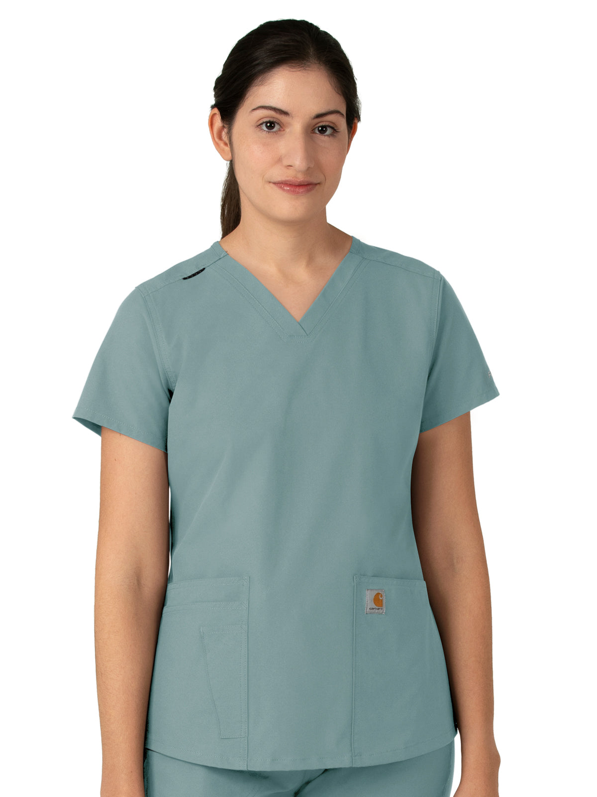 Built with Force technology to wick sweat, dry fast, and fight odors. FastDry® technology keeps you cool for all day comfort. Built to move with Rugged Flex® stretch technology. Stain Breaker® technology releases stains. Corded badgeID loop at shoulder. Two large top loading front pockets with internal cell phone pocket at left and additional internal pocket with scissor pocket at right. Princess seaming at back for tailored fit. Curved shirttail hemline. Size M Back Length: 27 3/4".
