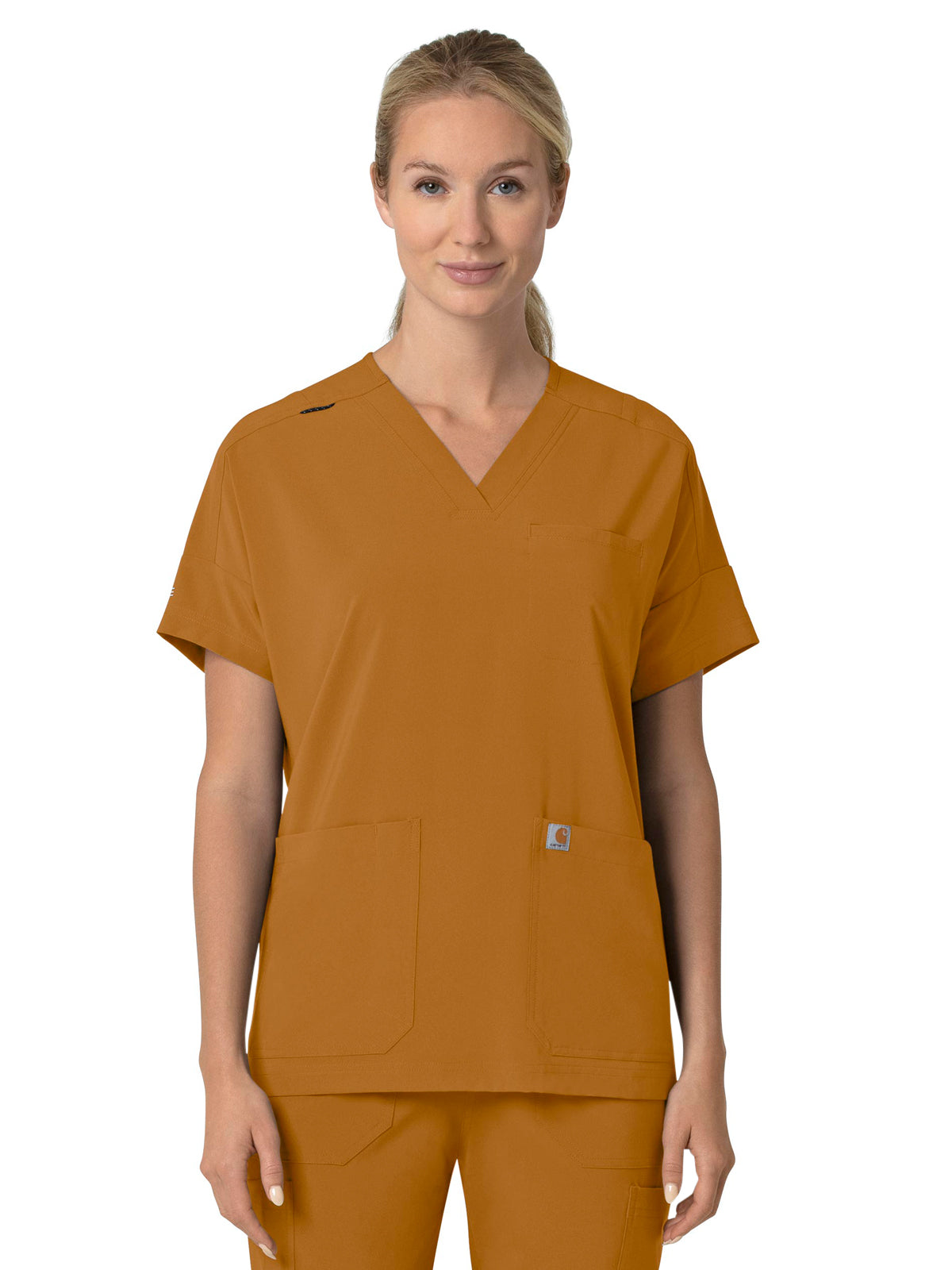 This women's modern fit scrub top features a curved v-neck at front with a slim binding at back neck, double needle stitching at the forward shoulders and a badge loop at the wearer's right, welt pocket at the chest, two front oversized top loading pockets with an internal mesh cell phone pocket on the left and a pen slot on the right, vented yoke with a mesh layer for breathability, straight hem at the front and slightly curved in the back, and a double needle topstitching throughout the garment for additional durability. Size M Back Length: 29", Size M Front Length: 28 1/2". Stretch dobby fabric: 94% Polyester, 6% Spandex.