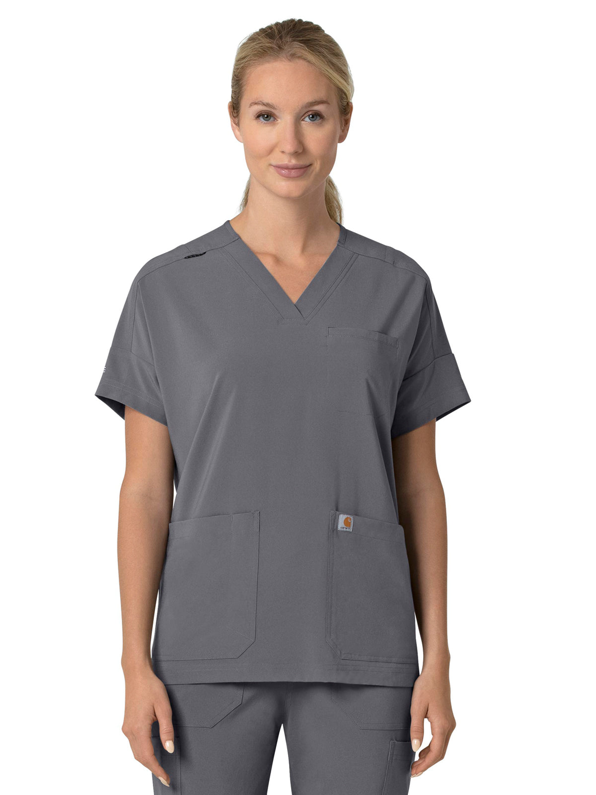 This women's modern fit scrub top features a curved v-neck at front with a slim binding at back neck, double needle stitching at the forward shoulders and a badge loop at the wearer's right, welt pocket at the chest, two front oversized top loading pockets with an internal mesh cell phone pocket on the left and a pen slot on the right, vented yoke with a mesh layer for breathability, straight hem at the front and slightly curved in the back, and a double needle topstitching throughout the garment for additional durability. Size M Back Length: 29", Size M Front Length: 28 1/2". Stretch dobby fabric: 94% Polyester, 6% Spandex.