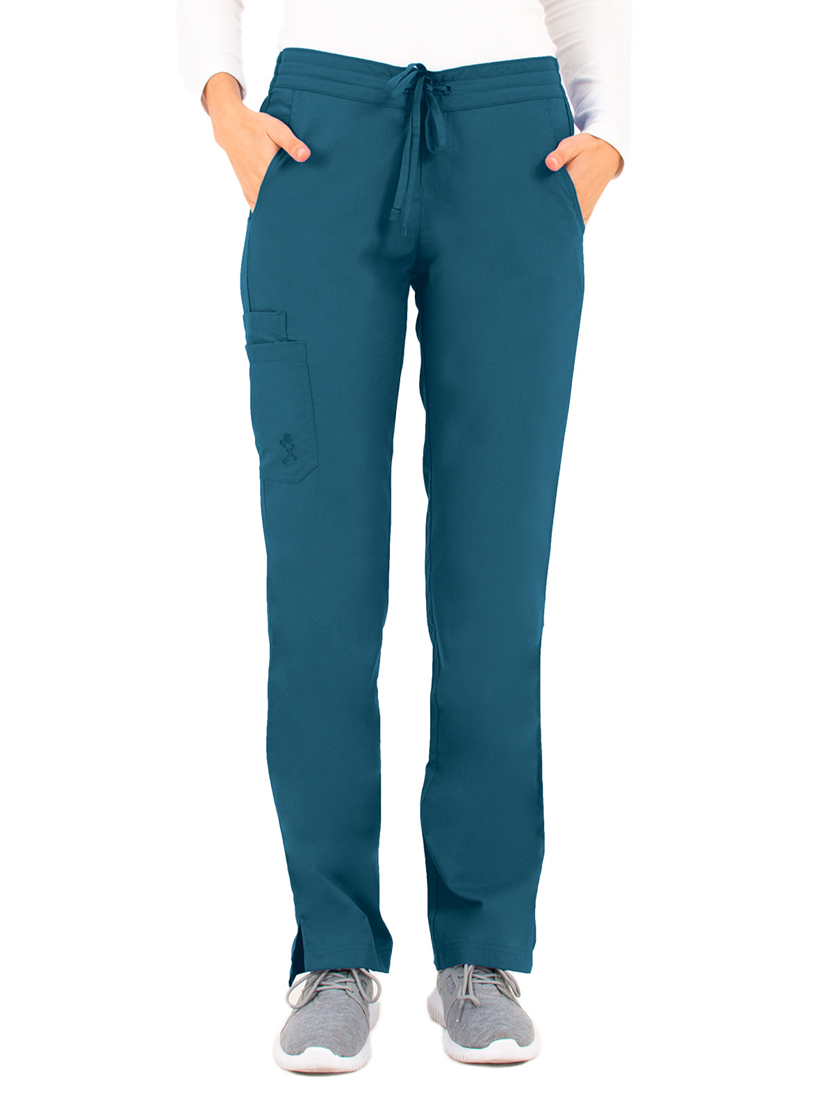 The LifeThreads Ergo 2.0 women's Modern fit utility pant features two front slant pockets, two back patch pockets, a stacked cargo pocket, low-rise waist, tapered leg, an elastic back waist with a flat front, and an adjustable front drawstring. Regular inseam: 31" Petite inseam: 29" Tall inseam: 33"