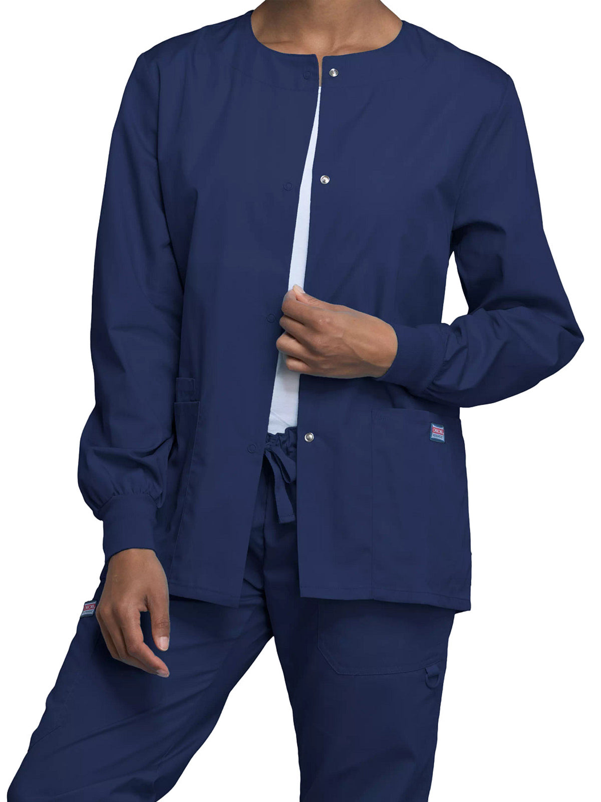A traditional fit, round neck, snap front warm-up includes two patch pockets, knit cuffs, and a cell phone pocket.
