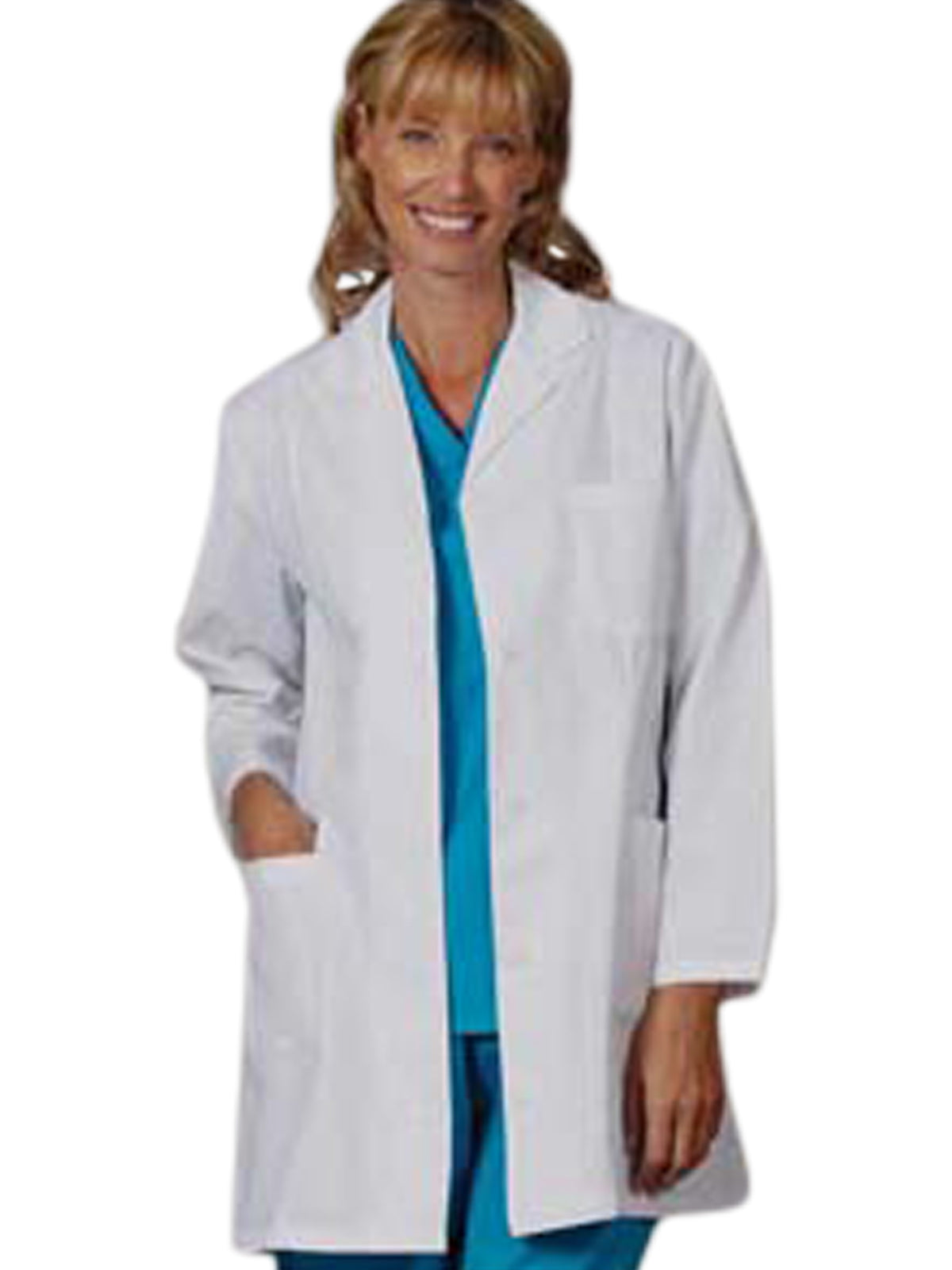 This women's 35" fashion lab coat features a plastic button closure, 1 chest pocket, 2 lower pockets, princess seams, and a half-back belt.