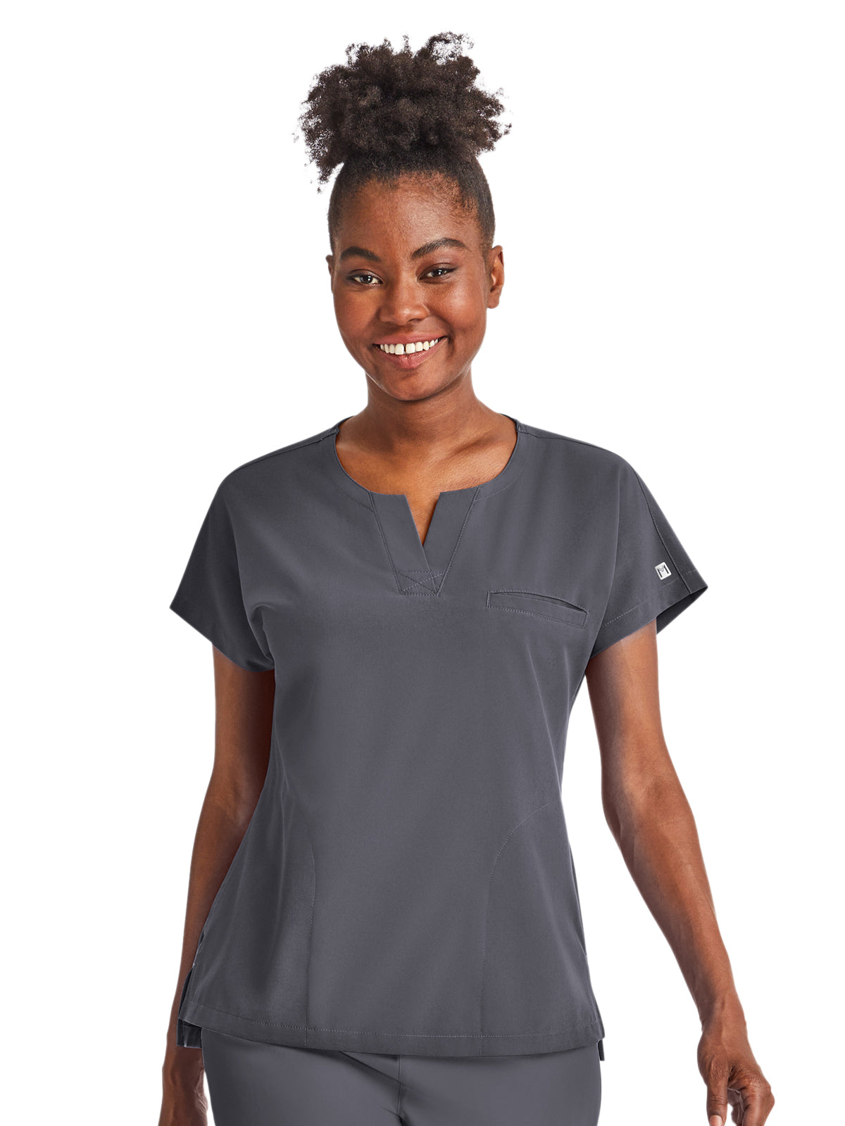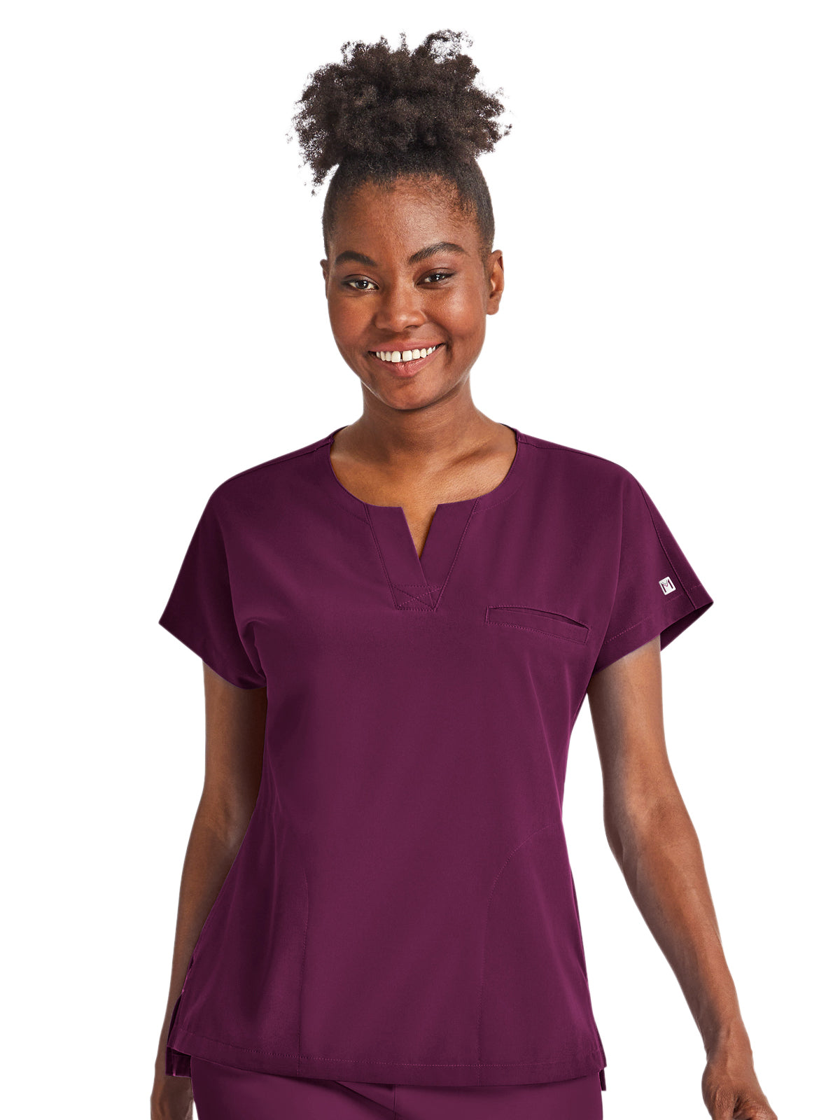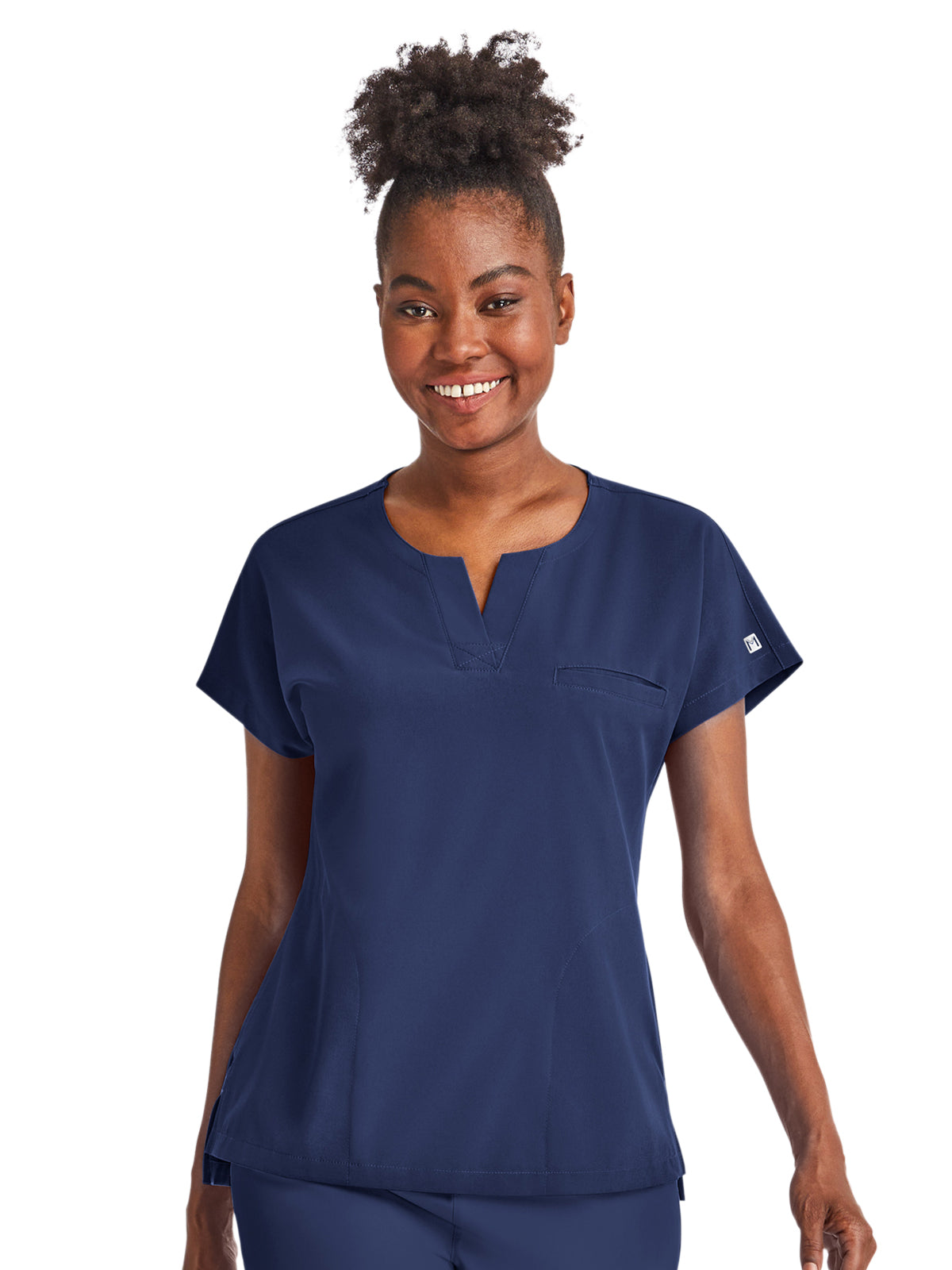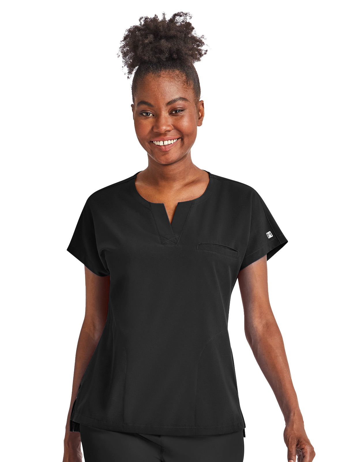 This women's notched neck dolman top offers a slim fit and is made with 4-way stretch, shape retention fabric for maximum comfort and flexibility. It features three pockets, including a welt chest pocket and two side entry pockets, providing ample storage space. The darted back design enhances shaping, while the shoulder and back yoke detail adds a stylish touch. With a shirttail hem and side vents, this top allows for easy movement throughout the day.