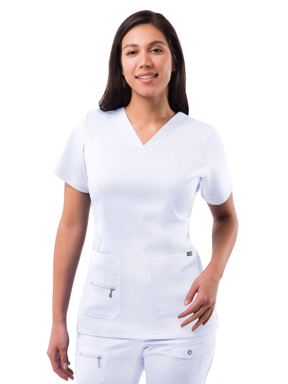 An elevated version of the classic v-neck scrub top. Beautiful details such as a double stitched neckline, back and front curved princess seams, shaped patch pockets, and super soft stretch fabric truly make this scrub top a crowd favorite. Iconic Adar zipper detail adorns the front pocket. Features such as double stitching with tonal thread and odor/wrinkle-resistant fabric make it just as durable as it is beautiful. Center back length is 25 1/2 inches in size S.