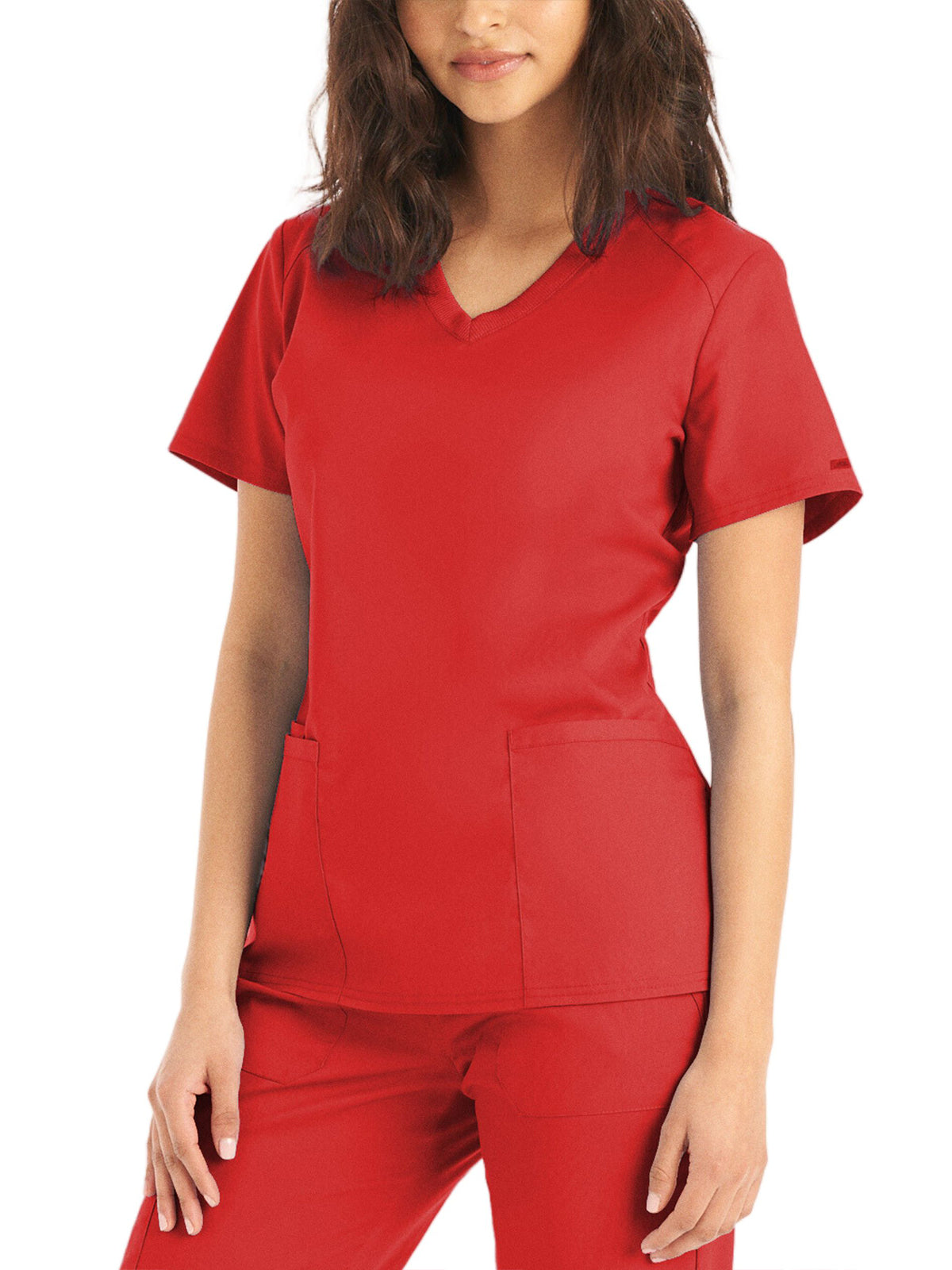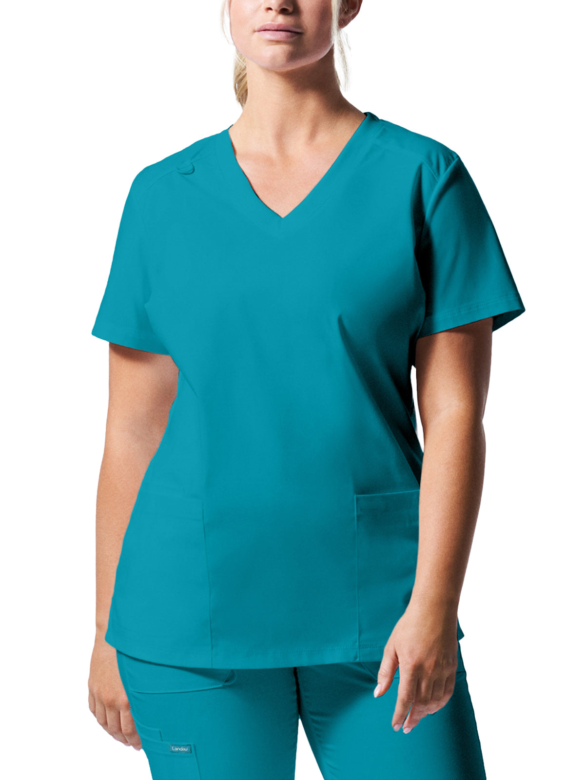 This Modern Fit, V-neck top not only is comfortable and high functioning. It features a rib knit neckband and back panels for extra comfort and movement. 2 Large pockets with a hidden elastic to hold stationary items close at hand an additional small pocket and side vents makes it perfect for your busy workday. Size Small length: 26"