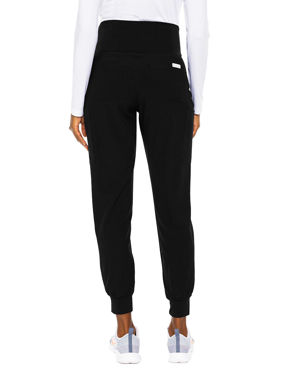 This Maternity fit jogger features a soft, dyed-to-match jersey knit high rise waist panel for belly coverage. There are four pockets for storage: two cargo pockets and two back patch pockets. Dyed-to-match jersey knit ankle cuffs. Tapered jogger leg, 9" leg opening. Inseam: 28 1/2"