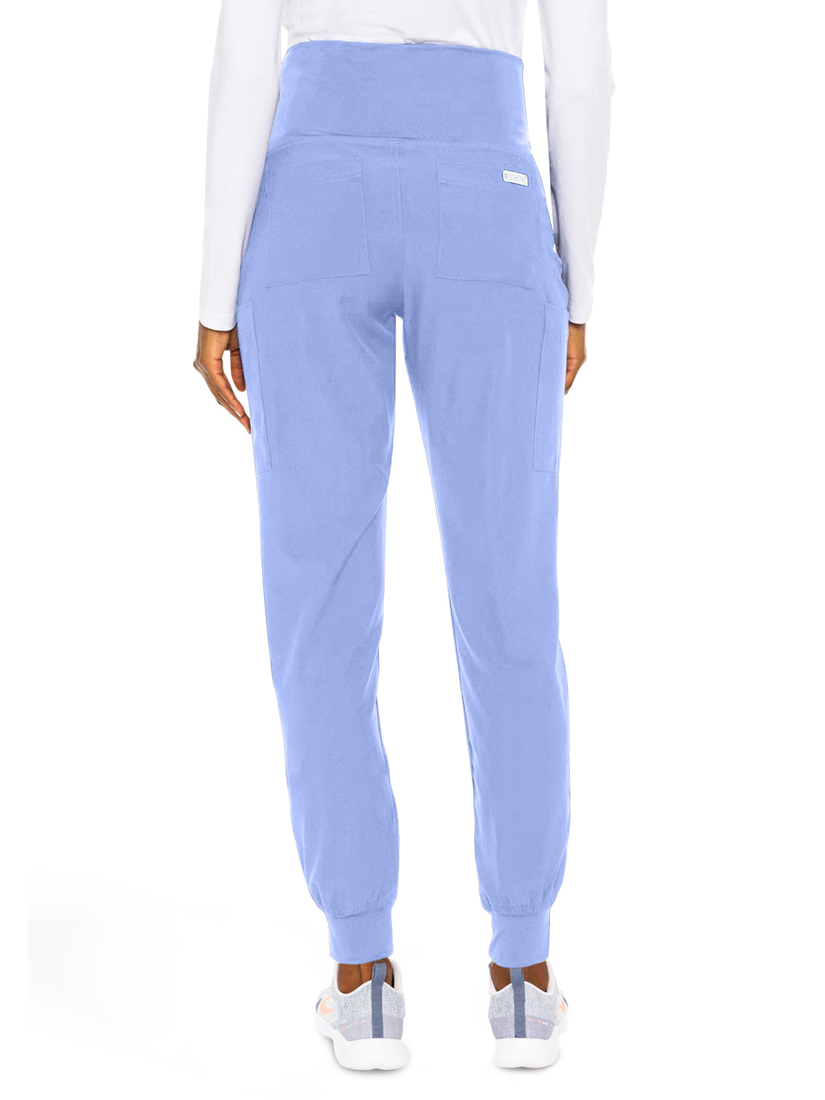 This Maternity fit jogger features a soft, dyed-to-match jersey knit high rise waist panel for belly coverage. There are four pockets for storage: two cargo pockets and two back patch pockets. Dyed-to-match jersey knit ankle cuffs. Tapered jogger leg, 9" leg opening. Inseam: 28 1/2"