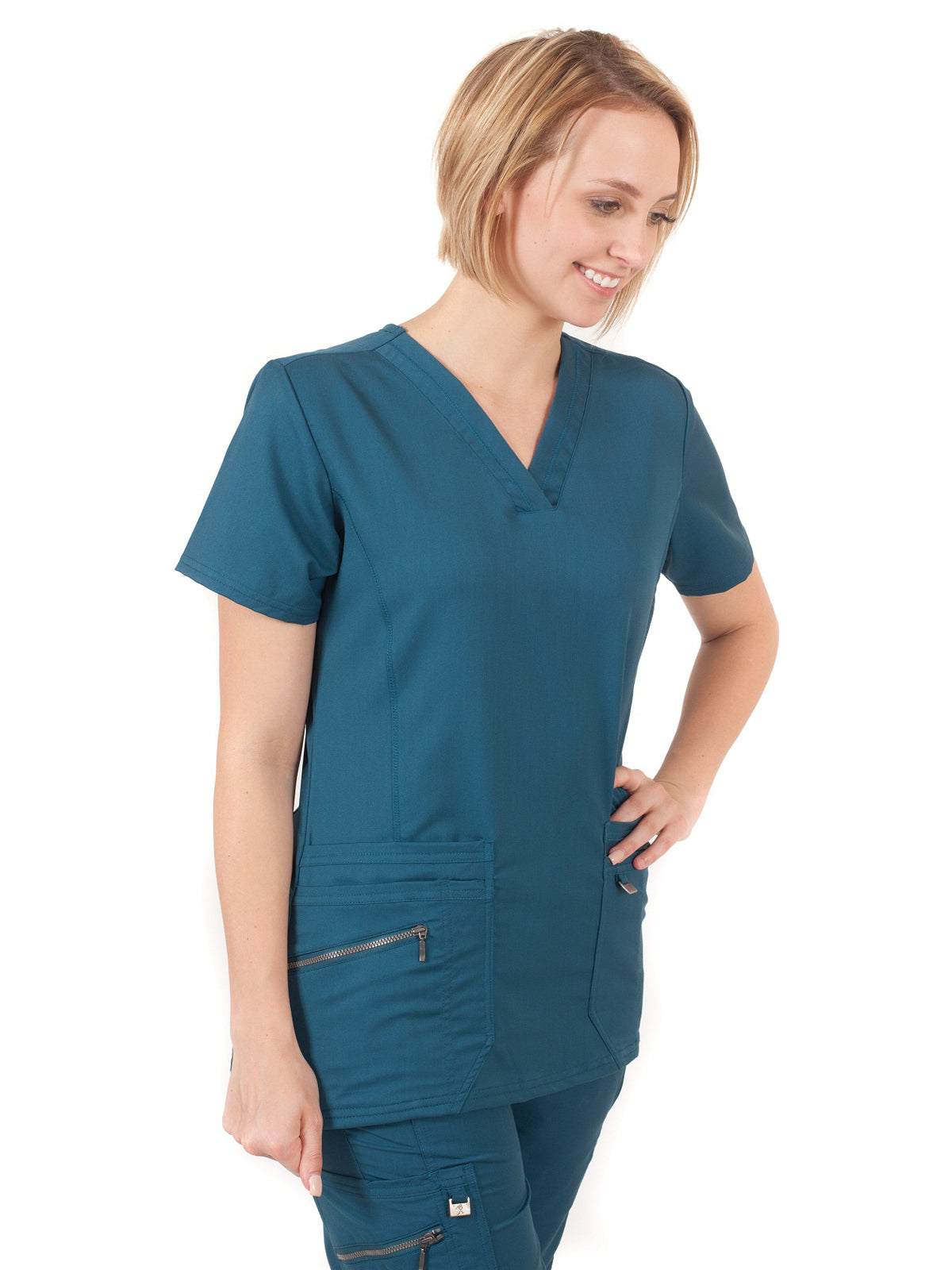 The LifeThreads Ergo 2.0 women's modern fit fv-neck top features 7 pockets with multi-functional details, an I.D. ring on front pocket for easy access and an embroidered logo on the back yoke. Center back length: 26" (Medium)