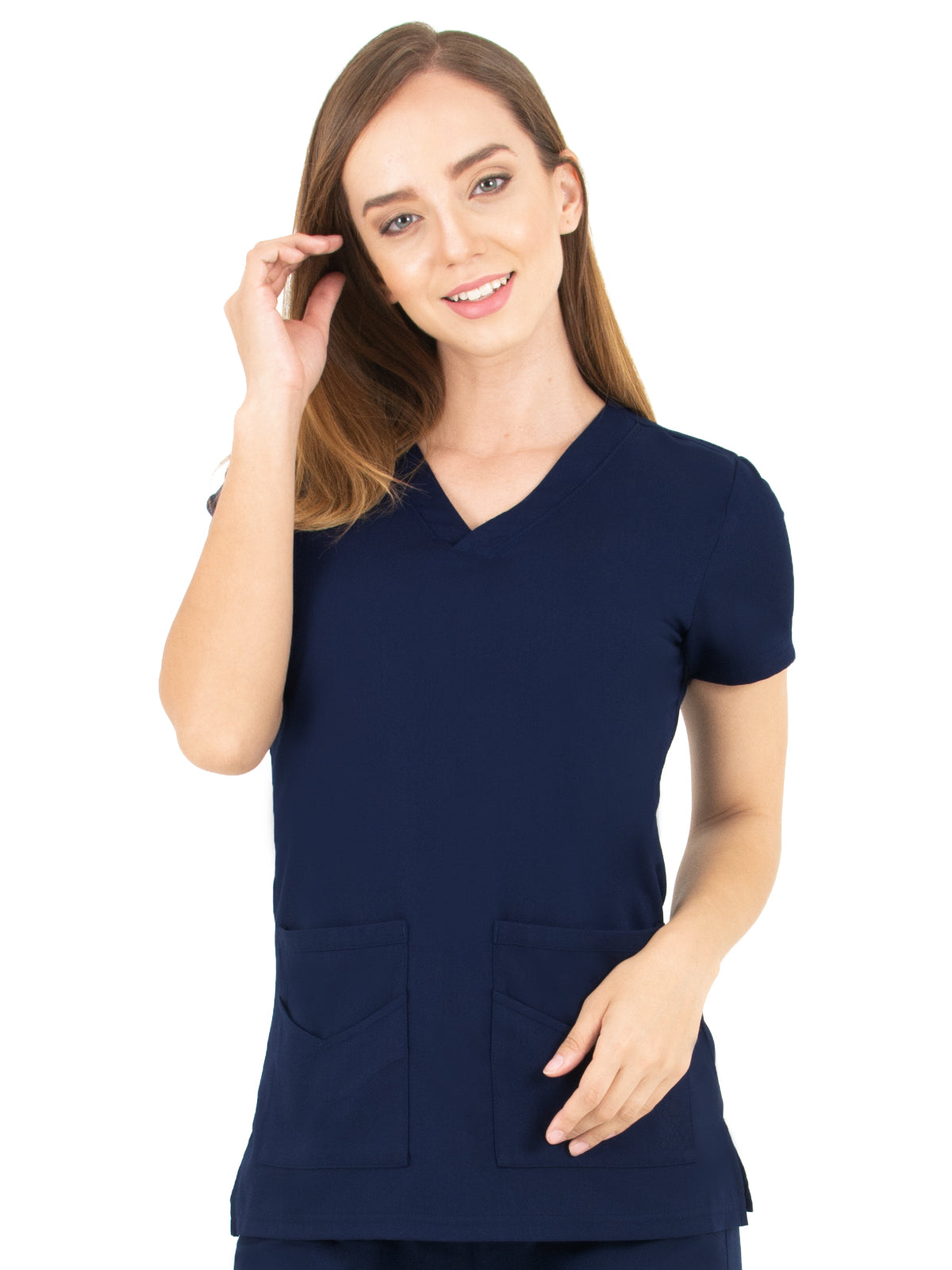 The LifeThreads Ergo 2.0 women's modern fit utility top features two front sectional pockets with six storage slots, front bust and back waist darts, and a banded v-neckline. Center back length: 25.5" (Medium)