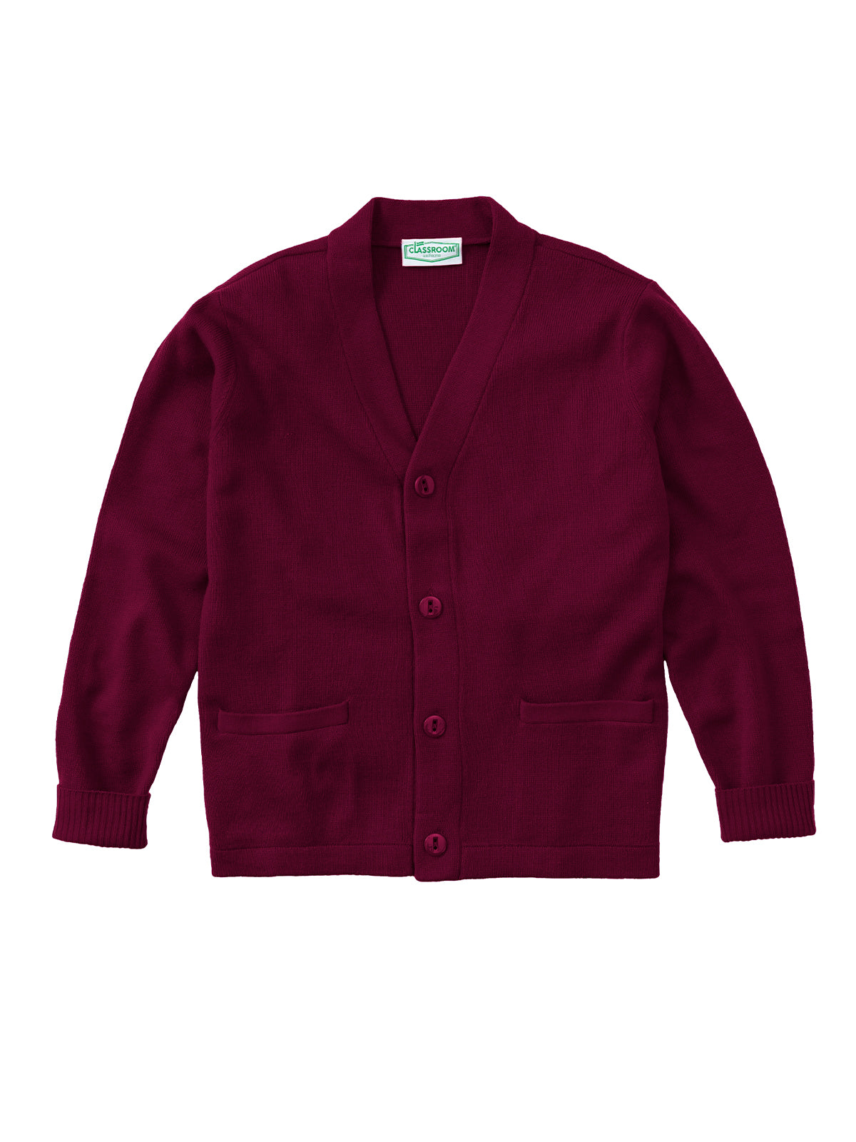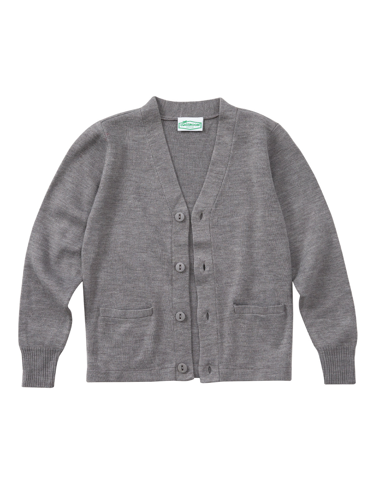Youth sized unisex no-pill V-neck cardigan with half Milano stitch, dyed-to-match buttons, two welt pockets, ribbed cuffs and hemmed bottom.